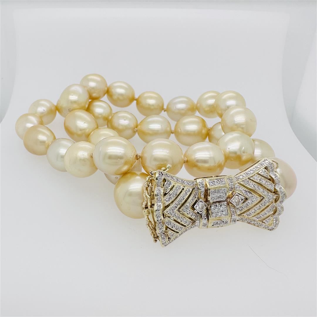 One graduated single strand pearl necklace 18.5" princess length, knotted with a tongue clasp & foldover safety containing 29 south sea cultured pearls, 14.2mm to 12.1mm in size. The pearls are light golden in color with a very good luster, near round, and lightly blemished with very good matching. The featured pearl necklace has a 14KT yellow gold bow motif clasp encrusted with diamonds. Graded on the strand. South Sea cultured pearls are farmed in the oceans surrounding Australia, Indonesia, the Philippines and the southern coast of China. The main source of Australian South Sea pearls lies in the northwest on the Kimberly coast. South Sea cultured pearls are formed in the Pinctada Maxima oyster, which is the world's largest pearl cultivating oyster and is native to the South China Sea, the Java, the Indian and the Pacific Oceans. There are two varieties of the Pinctada Maxima oyster: the Gold Lipped oyster which produces golden colored pearls, and the Silver Lipped oyster which produces white colored pearls. These pearls take between two to three years to grow and have a unique nacre due to the fast moving and clean waters of the South Seas. Two prong set round brilliant cut diamonds, measuring 2.00 -1.95 x 1.23mm (depth est.) approximate total weight of 2 Stones = 0.06ct. Color of IJ, clarity of SI-1 to SI-2, cut is very good. Graded in the setting. One hundred thirty-two prong set single cut diamonds, measuring 1.10 1,00 x 0.65mm (depth est.) approximate total weight of 132 Stones = 0.60ct. Color of H-I, clarity of SI-1 to I-1, cut is good. Graded in the setting. Total Weight of Diamonds Total Weight of Total Estimated Retail Value 0.66ct. 110.00gm $ 26620.00