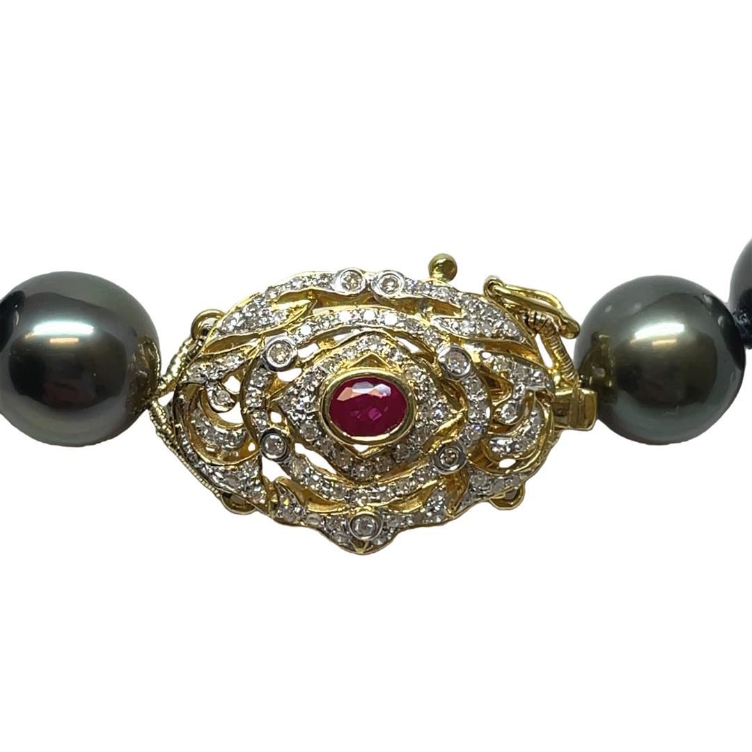 One graduated single strand pearl necklace 18.2" princess length, knotted with a tongue clasp & foldover safety containing 37 Tahitian pearls, 13.9mm to 10.1mm in size. The pearls are dark black in color, green overtone with a good luster, round to near round, and lightly blemished with excellent matching. The featured pearl necklace has a 14KT yellow gold oval floral motif clasp and 4 ruby set rondels. Graded on the strand.Tahitian cultured pearls form in the Pinctada Margaritifera oysters. This species is native to the central and South Pacific Ocean but is generally raised in lagoons by pearl farmers. Tahitian cultured pearls take between two to four years to form. One bezel set oval modified brilliant cut natural ruby, measuring 4.20 x 3.35 x 2.28mm, (depth est.) approximate weight of 0.30ct., clarity is slightly included, medium, strong, orangy red color, (GIA oR 5/5), cut is very good. Transmitting light with a minimum of distortion, transparent. Colored gemstones are presumed to have been subjected to commonly used enhancement processes. Graded in the setting. Forty-four channel set square step cut natural rubies, measuring 1.70 x 1.65 x 1.09mm, (depth est.) approximate total weight of 1.40ct., clarity is slightly included, medium, strong, red color, (GIA R 5/5), cut is very good. Transmitting light with a minimum of distortion, transparent. Colored gemstones are presumed to have been subjected to commonly used enhancement processes. Graded in the setting. Seven bezel set single cut diamonds, measuring 1.40 - 1.35 x 0.86mm (depth est.) approximate total weight of 7 Stones = 0.07ct. Graded in the setting. Color G - H Clarity SI-1 to SI-2 Cut Very Good Seventy-Four prong set single cut diamonds, measuring 1.10 - 1.00 x 0.62mm (depth est.) approximate total weight of 74 Stones = 0.30ct. Graded in the setting. Color G - H Clarity SI-1 to I-1 Cut Good Total Weight of Colored Stones 1.70ct. Total Weight of Diamonds 0.37ct. Total Weight of 80.50gm