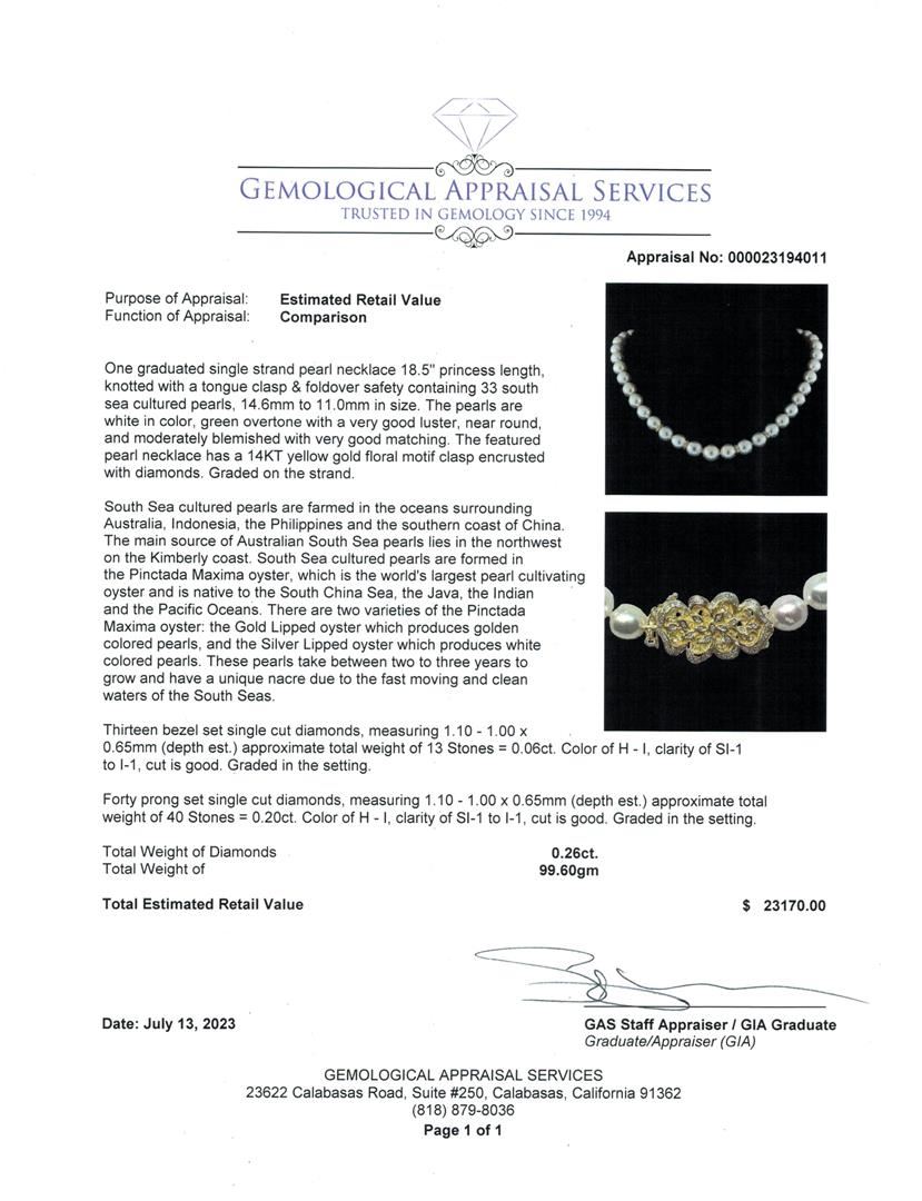 One graduated single strand pearl necklace 18.5" princess length, knotted with a tongue clasp & foldover safety containing 33 south sea cultured pearls, 14.6mm to 11.0mm in size. The pearls are white in color, green overtone with a very good luster, near round, and moderately blemished with very good matching. The featured pearl necklace has a 14KT yellow gold floral motif clasp encrusted with diamonds. Graded on the strand. South Sea cultured pearls are farmed in the oceans surrounding Australia, Indonesia, the Philippines and the southern coast of China. The main source of Australian South Sea pearls lies in the northwest on the Kimberly coast. South Sea cultured pearls are formed in the Pinctada Maxima oyster, which is the world's largest pearl cultivating oyster and is native to the South China Sea, the Java, the Indian and the Pacific Oceans. There are two varieties of the Pinctada Maxima oyster: the Gold Lipped oyster which produces golden colored pearls, and the Silver Lipped oyster which produces white colored pearls. These pearls take between two to three years to grow and have a unique nacre due to the fast moving and clean waters of the South Seas. Thirteen bezel set single cut diamonds, measuring 1.10 -1.00 x 0.65mm (depth est.) approximate total weight of 13 Stones = 0.06ct. Color of H - I, clarity of SI-1 to 1-1, cut is good. Graded in the setting. Forty prong set single cut diamonds, measuring 1.10 1.00 x 0.65mm (depth est.) approximate total weight of 40 Stones = 0.20ct. Color of H-1, clarity of SI-1 to I-1, cut is good. Graded in the setting. Total Weight of Diamonds Total Weight of Total Estimated Retail Value 0.26ct. 99.60gm $ 23170.00