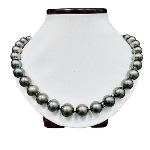 One graduated single strand pearl necklace 18.5" princess length, knotted with a tongue clasp & foldover safety containing 35 Tahitian pearls, 13.9mm to 11.1mm in size. The pearls are black in color, green overtone with a very good luster, round to near round, and mostly clean with very good matching. The featured pearl necklace has a 14KT yellow gold bow shaped with a Art Deco motif clasp encrusted with diamonds and sapphires. Graded on the strand.Tahitian cultured pearls form in the Pinctada Margaritifera oysters. This species is native to the central and South Pacific Ocean but is generally raised in lagoons by pearl farmers. Tahitian cultured pearls take between two to four years to form. Six channel set square step cut natural blue sapphires, measuring 2.20 x 2.00 x 1.37mm, (depth est.) approximate total weight of 0.36ct., clarity is eye clean, medium, strong, blue color, (GIA B 5/5), cut is good. Colored gemstones are presumed to have been subjected to commonly used enhancement processes. Transmitting light with a minimum of distortion, transparent. Graded in the setting.Forty-eight channel set round modified brilliant cut natural blue sapphires, measuring 2.10 - 2.00 x 1.33 mm, (depth est.) approximate total weight of 2.40ct., clarity is slightly included, dark, moderately strong, blue color, (GIA B 7/4), cut is good. Colored gemstones are presumed to have been subjected to commonly used enhancement processes. Transmitting light somewhat diffusely, transparent to translucent. Graded in the setting.Fifty-Six prong set single cut diamonds, measuring 1.10 - 1.00 x 0.63mm (depth est.) approximate total weight of 56 Stones = 0.24ct. Graded in the setting.Color H - IClarity SI-1 to I-1 Cut Good Total Weight of Colored Stones 2.76ct. Total Weight of Diamonds 0.24ct. Total Weight of 99.00gm