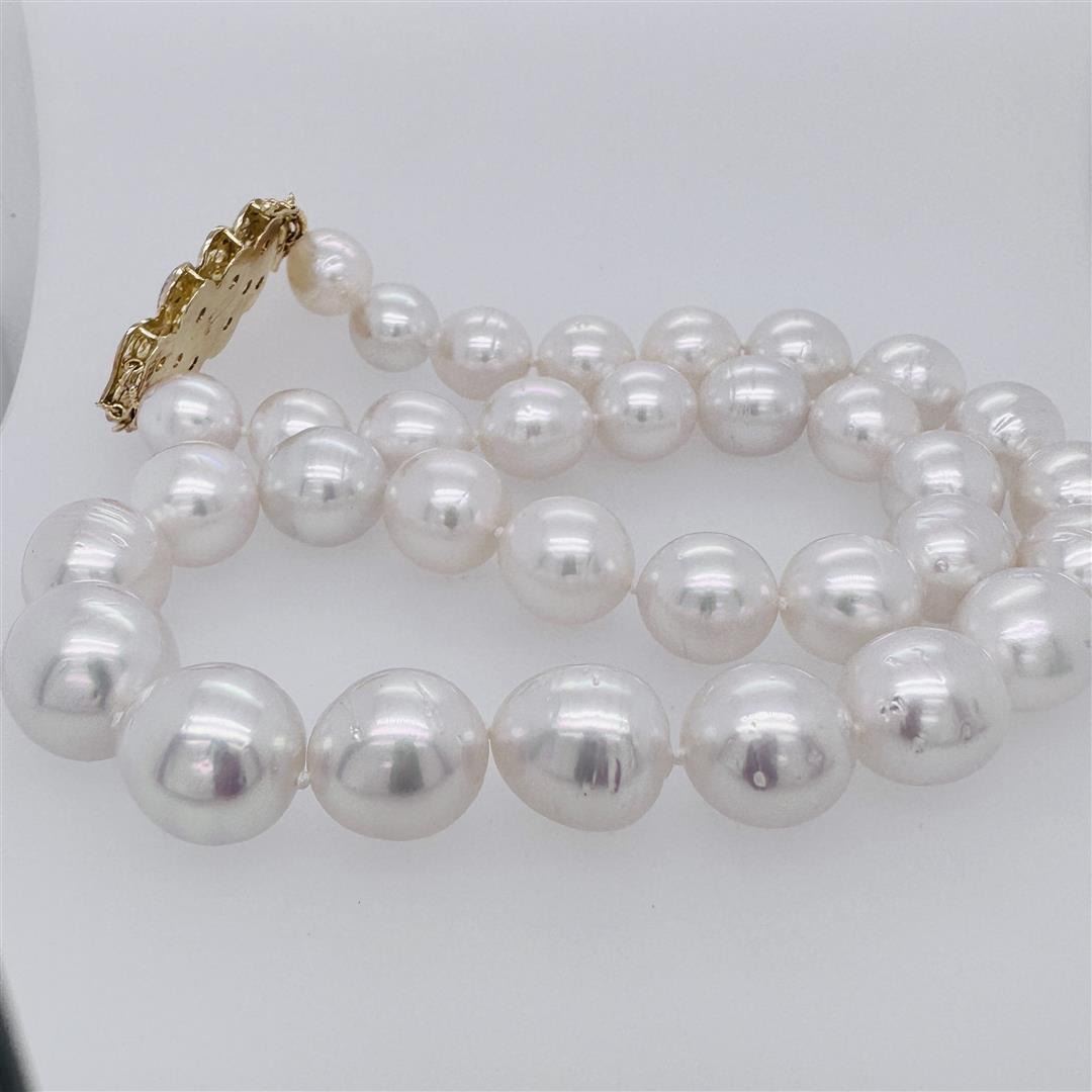 One graduated single strand pearl necklace 18.5" princess length, knotted with a tongue clasp & foldover safety containing 33 south sea cultured pearls, 14.6mm to 11.0mm in size. The pearls are white in color, green overtone with a very good luster, near round, and moderately blemished with very good matching. The featured pearl necklace has a 14KT yellow gold floral motif clasp encrusted with diamonds. Graded on the strand. South Sea cultured pearls are farmed in the oceans surrounding Australia, Indonesia, the Philippines and the southern coast of China. The main source of Australian South Sea pearls lies in the northwest on the Kimberly coast. South Sea cultured pearls are formed in the Pinctada Maxima oyster, which is the world's largest pearl cultivating oyster and is native to the South China Sea, the Java, the Indian and the Pacific Oceans. There are two varieties of the Pinctada Maxima oyster: the Gold Lipped oyster which produces golden colored pearls, and the Silver Lipped oyster which produces white colored pearls. These pearls take between two to three years to grow and have a unique nacre due to the fast moving and clean waters of the South Seas. Thirteen bezel set single cut diamonds, measuring 1.10 -1.00 x 0.65mm (depth est.) approximate total weight of 13 Stones = 0.06ct. Color of H - I, clarity of SI-1 to 1-1, cut is good. Graded in the setting. Forty prong set single cut diamonds, measuring 1.10 1.00 x 0.65mm (depth est.) approximate total weight of 40 Stones = 0.20ct. Color of H-1, clarity of SI-1 to I-1, cut is good. Graded in the setting. Total Weight of Diamonds Total Weight of Total Estimated Retail Value 0.26ct. 99.60gm $ 23170.00