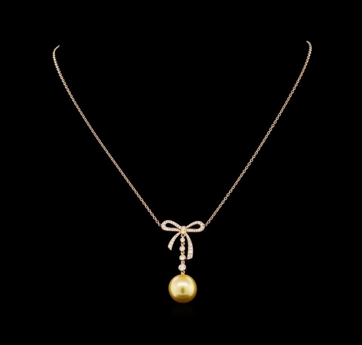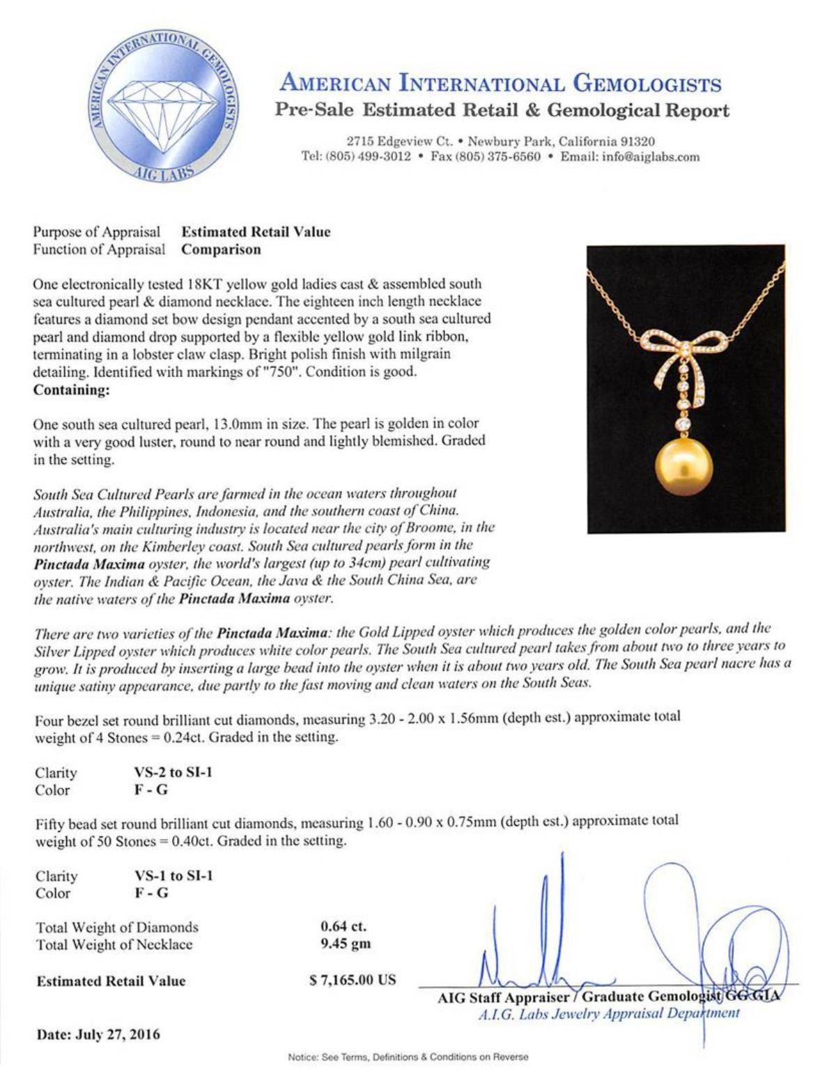 One south sea cultured pearl, 13.0mm in size. The pearl is golden in color with a very good luster, round to near round, lightly blemished Graded in the setting. South Sea Cultured Pearls are farmed in the ocean waters throughout Australia, the Philippines, Indonesia, and the southern coast of China. Australia's main culturing industry is located near the city of Broome, in the northwest, on the Kimberley coast. South Sea cultured pearls form in the Pinctada Maxima oyster, the world's largest (up to 34cm) pearl cultivating oyster. The Indian & Pacific Ocean, the Java & the South China Sea, are the native waters of the Pinctada Maxima oyster. There are two varieties of the Pinctada Maxima: the Gold Lipped oyster which produces the golden color pearls, and the Silver Lipped oyster which produces white color pearls. The South Sea cultured pearl takes from about two to three years to grow. It is produced by inserting a large bead into the oyster when it is about two years old. The South Sea pearl nacre has a unique satiny appearance, due partly to the fast moving and clean waters on the South Seas. Four bezel set round brilliant cut diamonds, measuring 3.20 - 2.00 x 1.56mm (depth est.) approximate total weight of 4 Stones = 0.24ct. Graded in the setting. Clarity VS-2 to SI-1. Color: F - G Fifty bead set round brilliant cut diamonds, measuring 1.60 - 0.90 x 0.75mm (depth est.) approximate total weight of 50 Stones = 0.40ct. Graded in the setting. Clarity VS-1 to SI-1. Color: F - G. Total Weight of Diamonds 0.64ct.. Total Weight of Necklace 9.45gm. AIG Appraised.