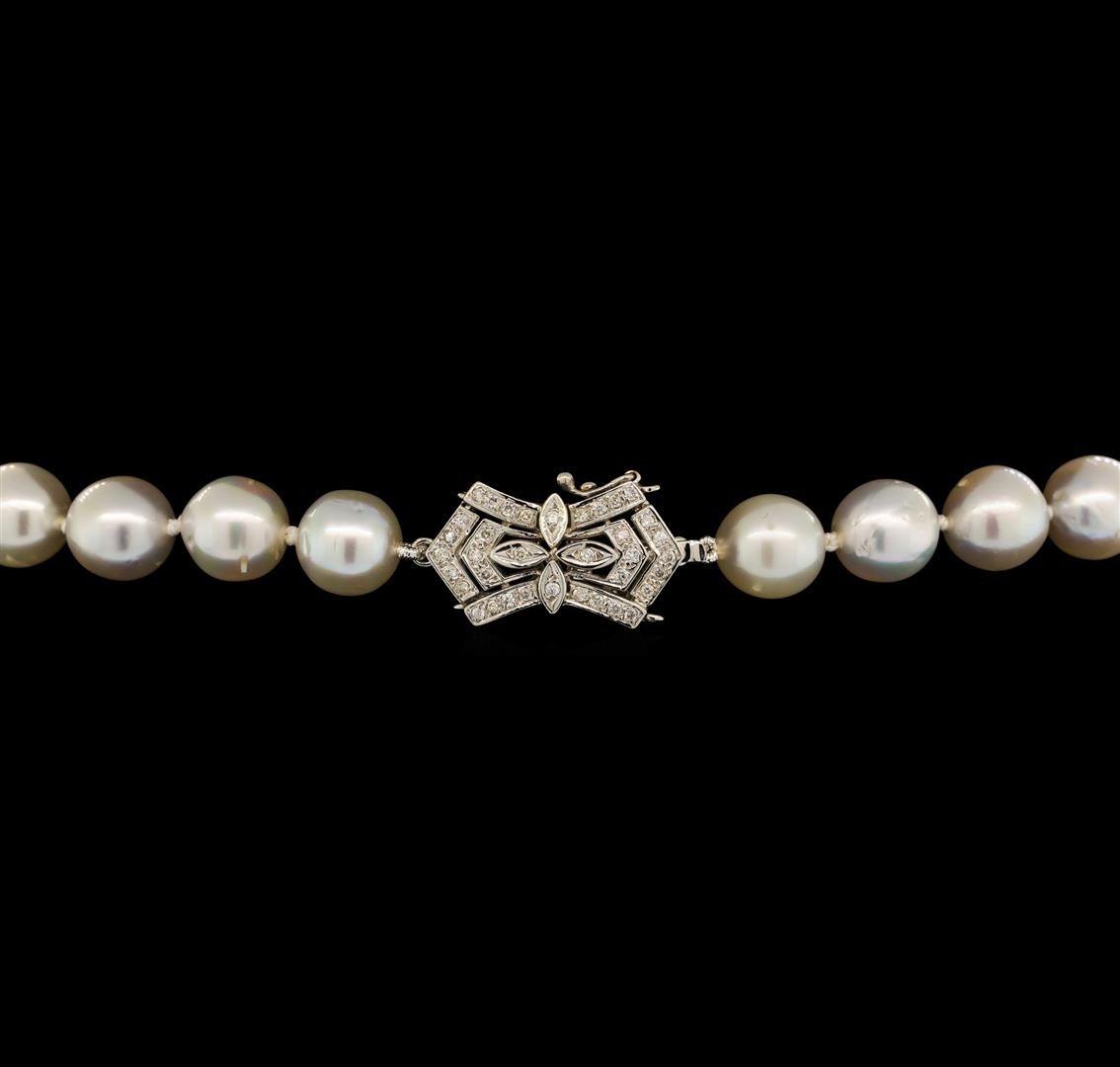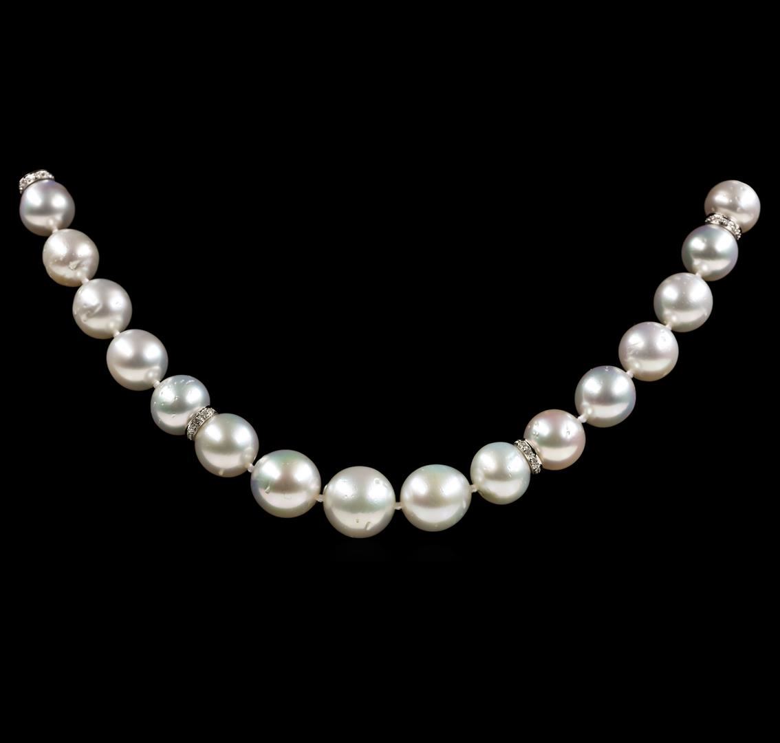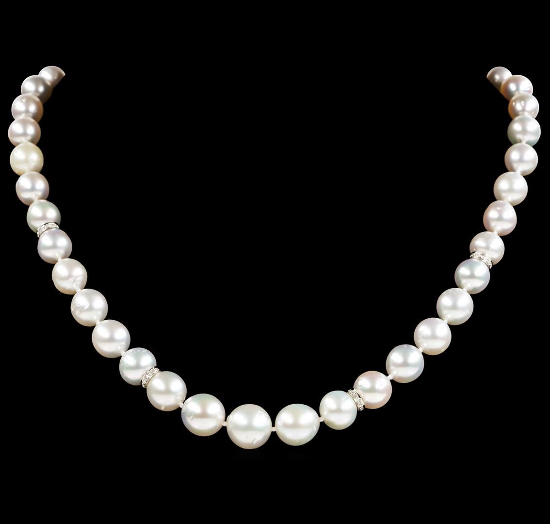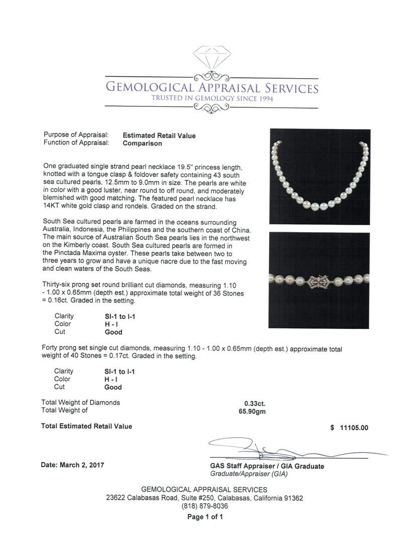 One graduated single strand pearl necklace 19.5' princess length, knotted with a tongue clasp & foldover safety containing 43 south sea cultured pearls, 12.5mm to 9.0mm in size. The pearls are white in color with a good luster, near round to off round, and moderately blemished with good matching. The featured pearl necklace has 14KT white gold clasp and rondels. Graded on the strand.South Sea cultured pearls are farmed in the oceans surrounding Australia, Indonesia, the Philippines and the southern coast of China. The main source of Australian South Sea pearls lies in the northwest on the Kimberly coast. South Sea cultured pearls are formed in the Pinctada Maxima oyster. These pearls take between two to three years to grow and have a unique nacre due to the fast moving and clean waters of the South Seas. Thirty-Six prong set round brilliant cut diamonds, measuring 1.10 - 1.00 x 0.65mm (depth est.) approximate total weight of 36 Stones = 0.16ct. Graded in the setting. Color H - I Clarity SI-1 to I-1 Cut Good Forty prong set single cut diamonds, measuring 1.10 - 1.00 x 0.65mm (depth est.) approximate total weight of 40 Stones = 0.17ct. Graded in the setting. Color H - I Clarity SI-1 to I-1 Cut Good. Total Weight of Diamonds 0.33ct.. Total Weight of 65.90gm GAS Appraised at $11,105.00.