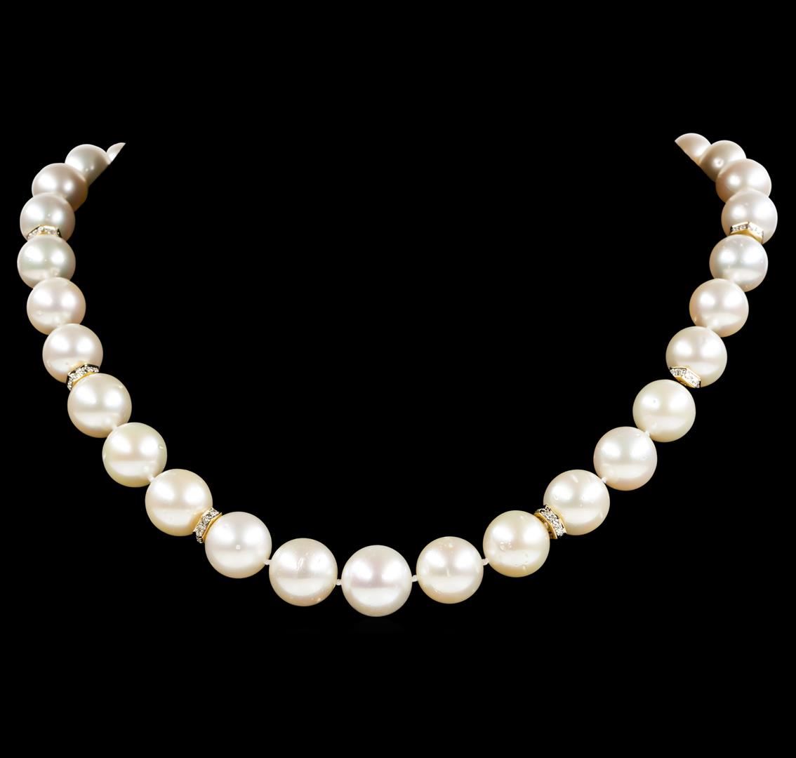 One graduated single strand pearl necklace 19.0' princess length, knotted with a tongue clasp & foldover safety containing 33 south sea cultured pearls, 14.6mm to 12.0mm in size. The pearls are light cream in color with a good luster, round to near round, and lightly blemished with very good matching. The featured pearl necklace has 14KT yellow gold clasp and rondels. Graded on the strand.South Sea cultured pearls are farmed in the oceans surrounding Australia, Indonesia, the Philippines and the southern coast of China. The main source of Australian South Sea pearls lies in the northwest on the Kimberly coast. South Sea cultured pearls are formed in the Pinctada Maxima oyster. These pearls take between two to three years to grow and have a unique nacre due to the fast moving and clean waters of the South Seas. Ninety-Eight prong set single cut diamonds, measuring 1.10 - 1.00 x 0.65mm (depth est.) approximate total weight of 98 Stones = 0.42ct. Graded in the setting. Color G - I Clarity SI-1 to I-1 Cut Good. Total Weight of Diamonds 0.42ct.. Total Weight of 107.00gm GAS Appraised at $31,810.00.