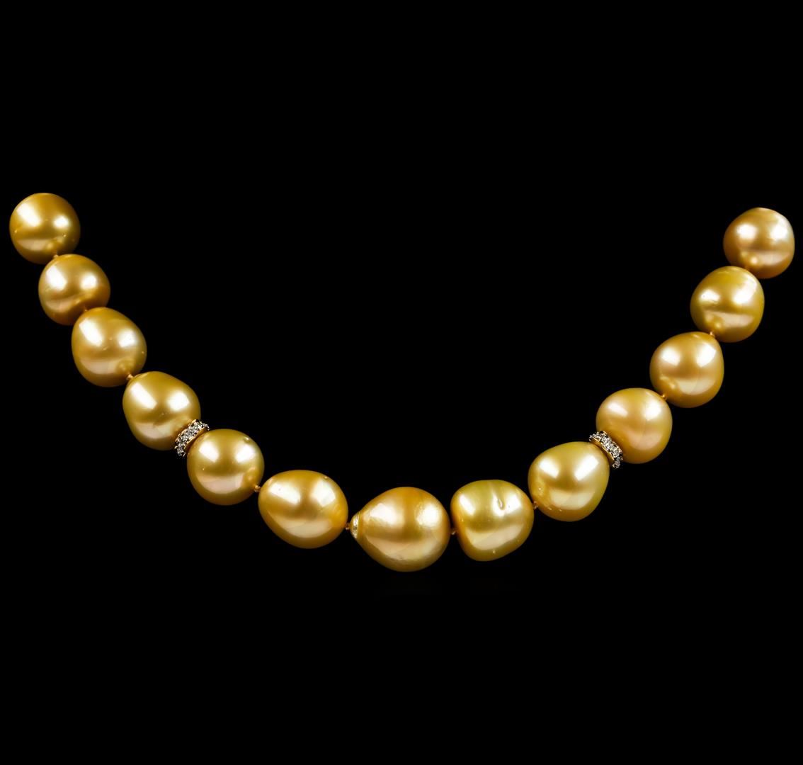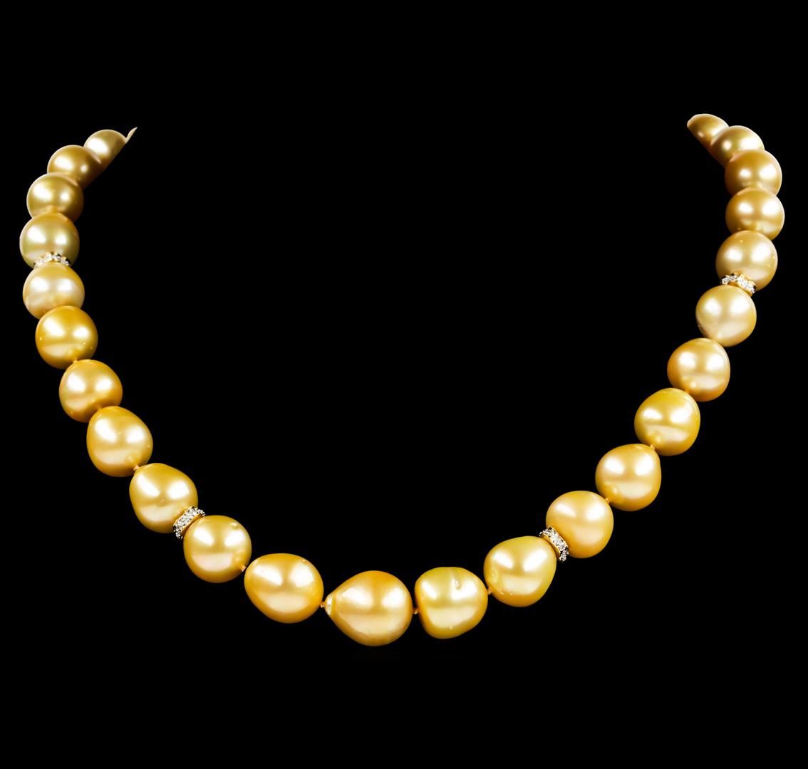 One graduated single strand pearl necklace 18.5' princess length, knotted with a tongue clasp & foldover safety containing 33 south sea cultured pearls, 14.9mm to 11.0mm in size. The pearls are dark golden in color with a good luster, off round, and mostly clean with good matching. The featured pearl necklace has 14KT yellow gold clasp and rondels. Graded on the strand.South Sea cultured pearls are farmed in the oceans surrounding Australia, Indonesia, the Philippines and the southern coast of China. The main source of Australian South Sea pearls lies in the northwest on the Kimberly coast. South Sea cultured pearls are formed in the Pinctada Maxima oyster. These pearls take between two to three years to grow and have a unique nacre due to the fast moving and clean waters of the South Seas. Forty-Seven prong set single cut diamonds, measuring 1.10 - 1.00 x 0.65mm (depth est.) approximate total weight of 47 Stones = 0.20ct. Graded in the setting. Color G - H Clarity VS-2 to SI-2 Cut Good. Total Weight of Diamonds 0.20ct.. Total Weight of 99.10gm GAS Appraised at $18,400.00.