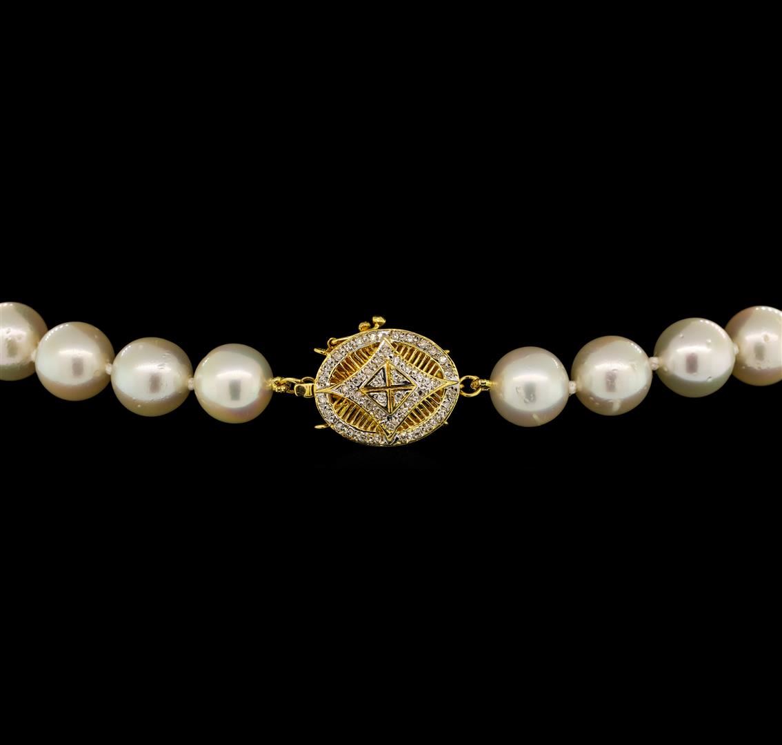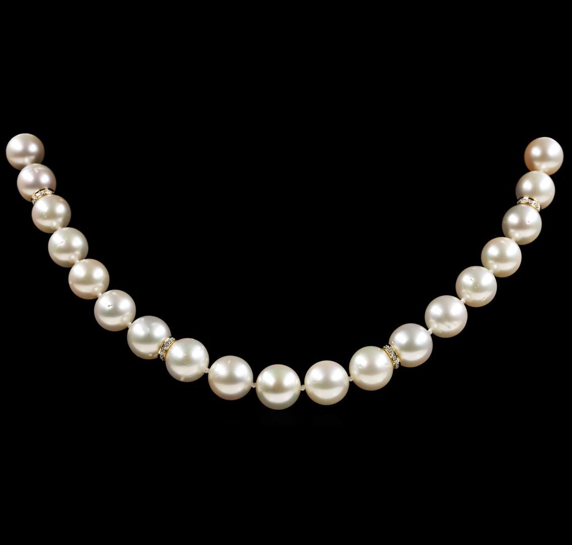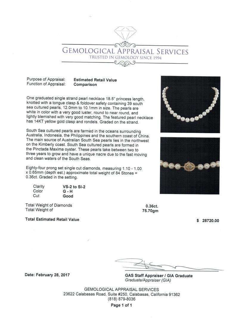 One graduated single strand pearl necklace 18.5' princess length, knotted with a tongue clasp & foldover safety containing 39 south sea cultured pearls, 12.0mm to 10.1mm in size. The pearls are white in color with a very good luster, round to near round, and lightly blemished with very good matching. The featured pearl necklace has 14KT yellow gold clasp and rondels. Graded on the strand.South Sea cultured pearls are farmed in the oceans surrounding Australia, Indonesia, the Philippines and the southern coast of China. The main source of Australian South Sea pearls lies in the northwest on the Kimberly coast. South Sea cultured pearls are formed in the Pinctada Maxima oyster. These pearls take between two to three years to grow and have a unique nacre due to the fast moving and clean waters of the South Seas. Eighty-Four prong set single cut diamonds, measuring 1.10 - 1.00 x 0.65mm (depth est.) approximate total weight of 84 Stones = 0.36ct. Graded in the setting. Color G - H Clarity VS-2 to SI-2 Cut Good. Total Weight of Diamonds 0.36ct.. Total Weight of 75.70gm GAS Appraised at $28,720.00.