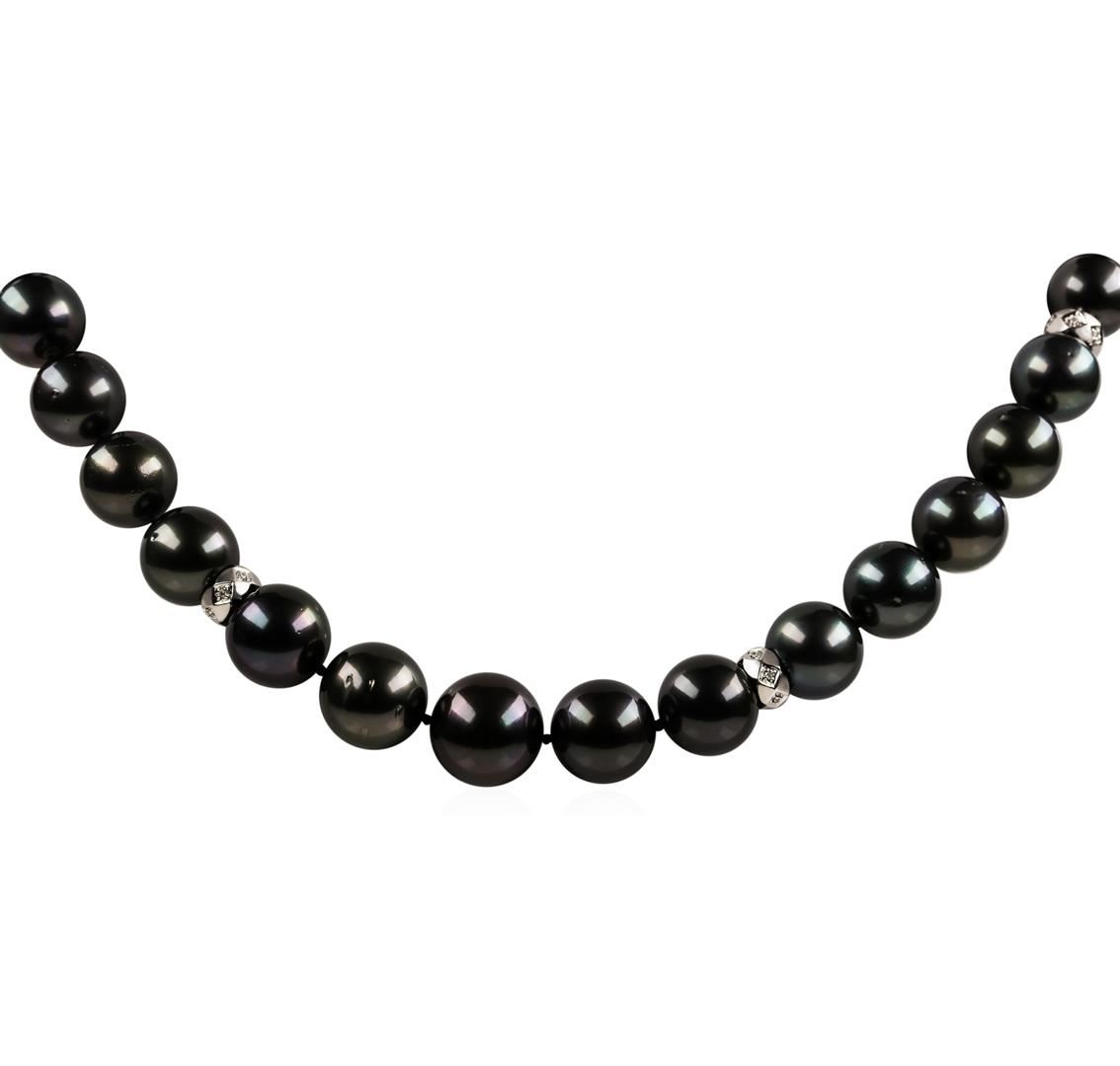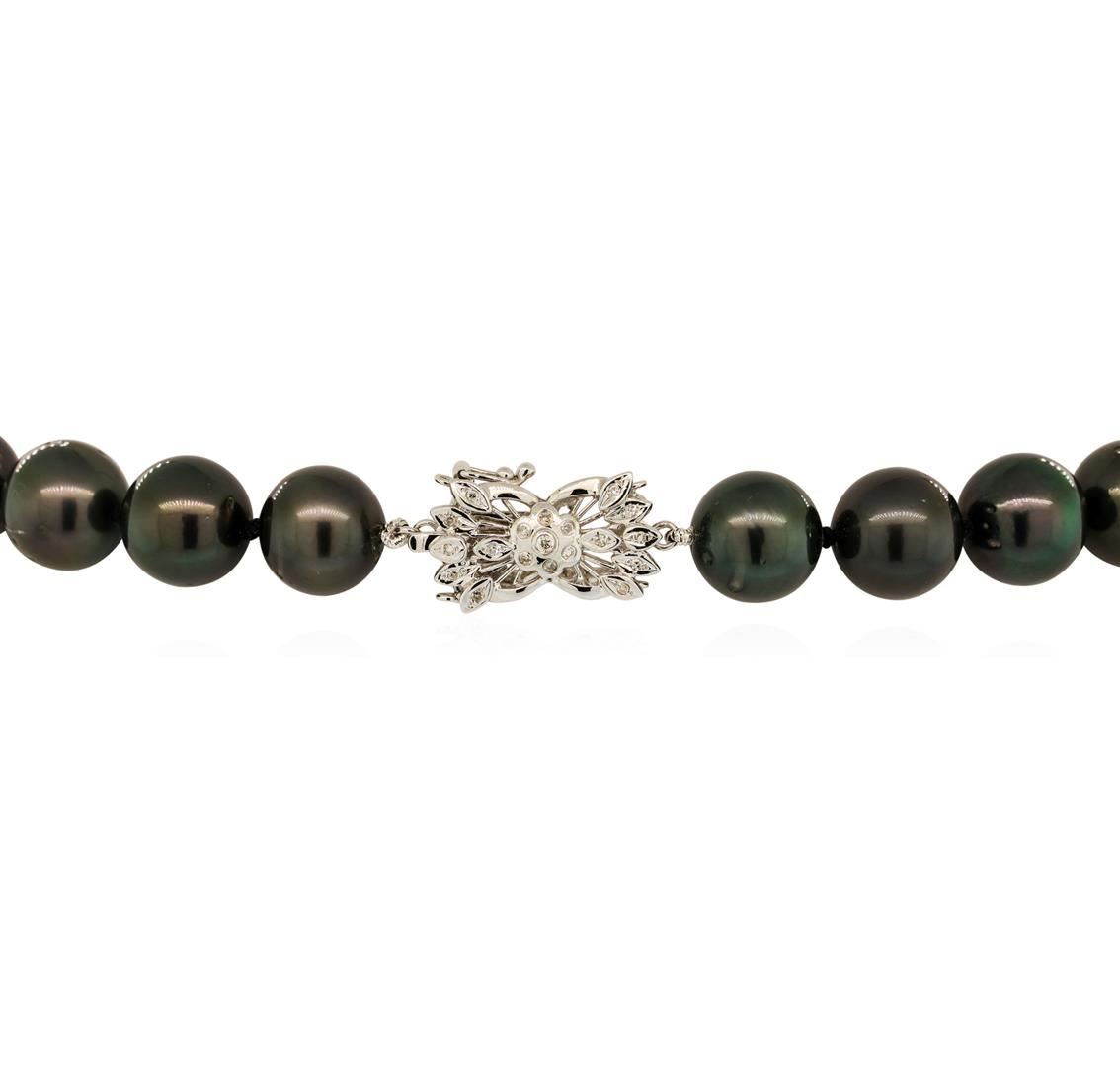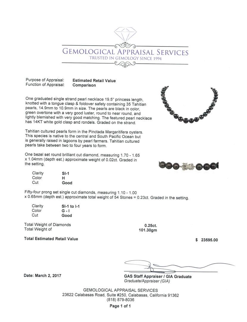 One graduated single strand pearl necklace 19.5' princess length, knotted with a tongue clasp & foldover safety containing 35 Tahitian pearls, 14.9mm to 10.9mm in size. The pearls are black in color, green overtone with a very good luster, round to near round, and lightly blemished with very good matching. The featured pearl necklace has 14KT white gold clasp and rondels. Graded on the strand.Tahitian cultured pearls form in the Pinctada Margaritifera oysters. This species is native to the central and South Pacific Ocean but is generally raised in lagoons by pearl farmers. Tahitian cultured pearls take between two to four years to form. One bezel set round brilliant cut diamond, measuring 1.70 - 1.65 x 1.04mm (depth est.) approximate weight of 0.02ct. Graded in the setting. Color H Clarity SI-1 Cut Good Fifty-Four prong set single cut diamonds, measuring 1.10 - 1.00 x 0.65mm (depth est.) approximate total weight of 54 Stones = 0.23ct. Graded in the setting. Color G - I Clarity SI-1 to I-1 Cut Good. Total Weight of Diamonds 0.25ct.. Total Weight of 101.30gm GAS Appraised at $23,595.00.