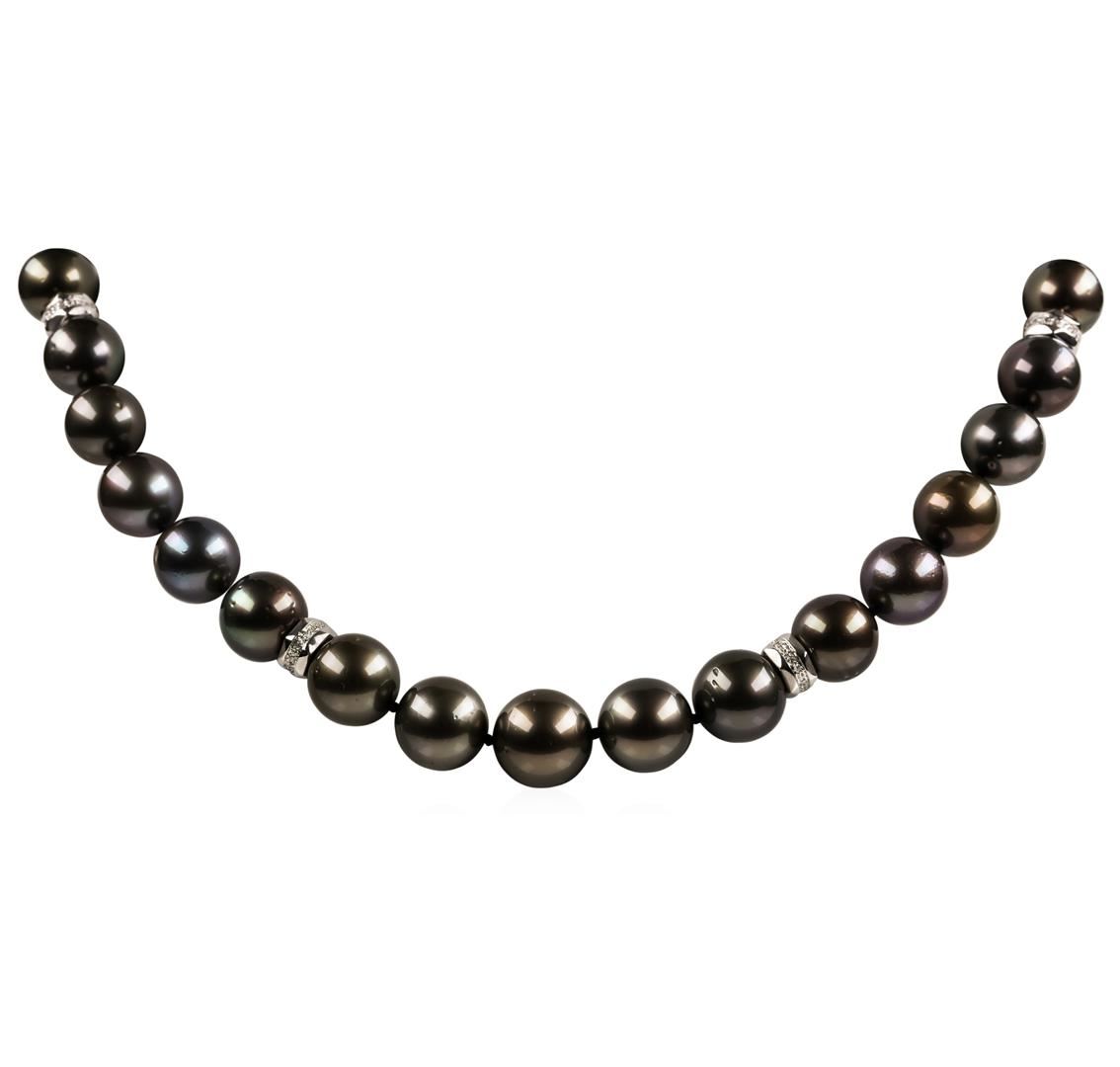One graduated single strand pearl necklace 19.0' princess length, knotted with a tongue clasp & foldover safety containing 35 Tahitian pearls, 13.6mm to 11.0mm in size. The pearls are black in color, green overtone with a good luster, round to near round, and lightly blemished with very good matching. The featured pearl necklace has 14KT white gold clasp and rondels. Graded on the strand.Tahitian cultured pearls form in the Pinctada Margaritifera oysters. This species is native to the central and South Pacific Ocean but is generally raised in lagoons by pearl farmers. Tahitian cultured pearls take between two to four years to form. Forty-Four prong set single cut diamonds, measuring 1.10 - 1.00 x 0.65mm (depth est.) approximate total weight of 44 Stones = 0.19ct. Graded in the setting. Color G - H Clarity SI-1 to I-1 Cut Good. Total Weight of Diamonds 0.19ct.. Total Weight of 91.50gm GAS Appraised at $23,860.00.
