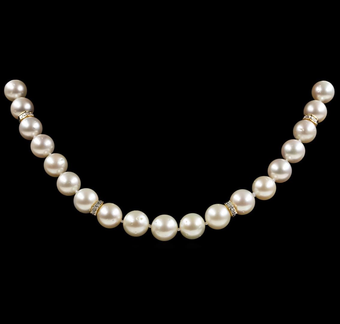 One graduated single strand pearl necklace 19.5' princess length, knotted with a toggle clasp containing 39 south sea cultured pearls, 11.8mm to 10.0mm in size. The pearls are white in color with a good luster, round to near round, and moderately blemished with very good matching. The featured pearl necklace has 14KT yellow gold clasp and rondels. Graded on the strand.South Sea cultured pearls are farmed in the oceans surrounding Australia, Indonesia, the Philippines and the southern coast of China. The main source of Australian South Sea pearls lies in the northwest on the Kimberly coast. South Sea cultured pearls are formed in the Pinctada Maxima oyster. These pearls take between two to three years to grow and have a unique nacre due to the fast moving and clean waters of the South Seas. Eighty-Four prong set single cut diamonds, measuring 1.10 - 1.00 x 0.65mm (depth est.) approximate total weight of 84 Stones = 0.36ct. Graded in the setting. Color G - H Clarity SI-1 to I-1 Cut Good. Total Weight of Diamonds 0.36ct.. Total Weight of 76.10gm GAS Appraised at $22,895.00.