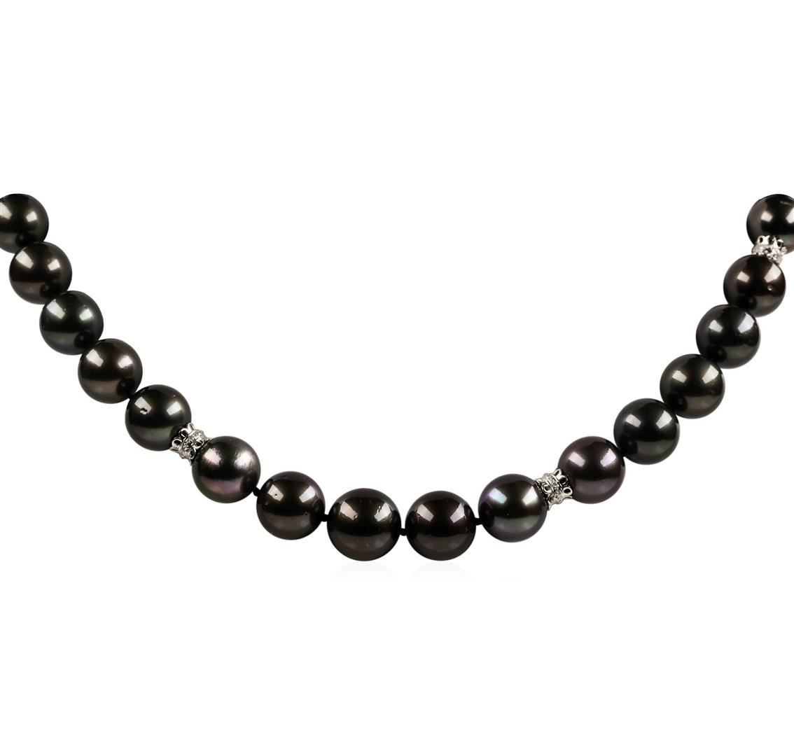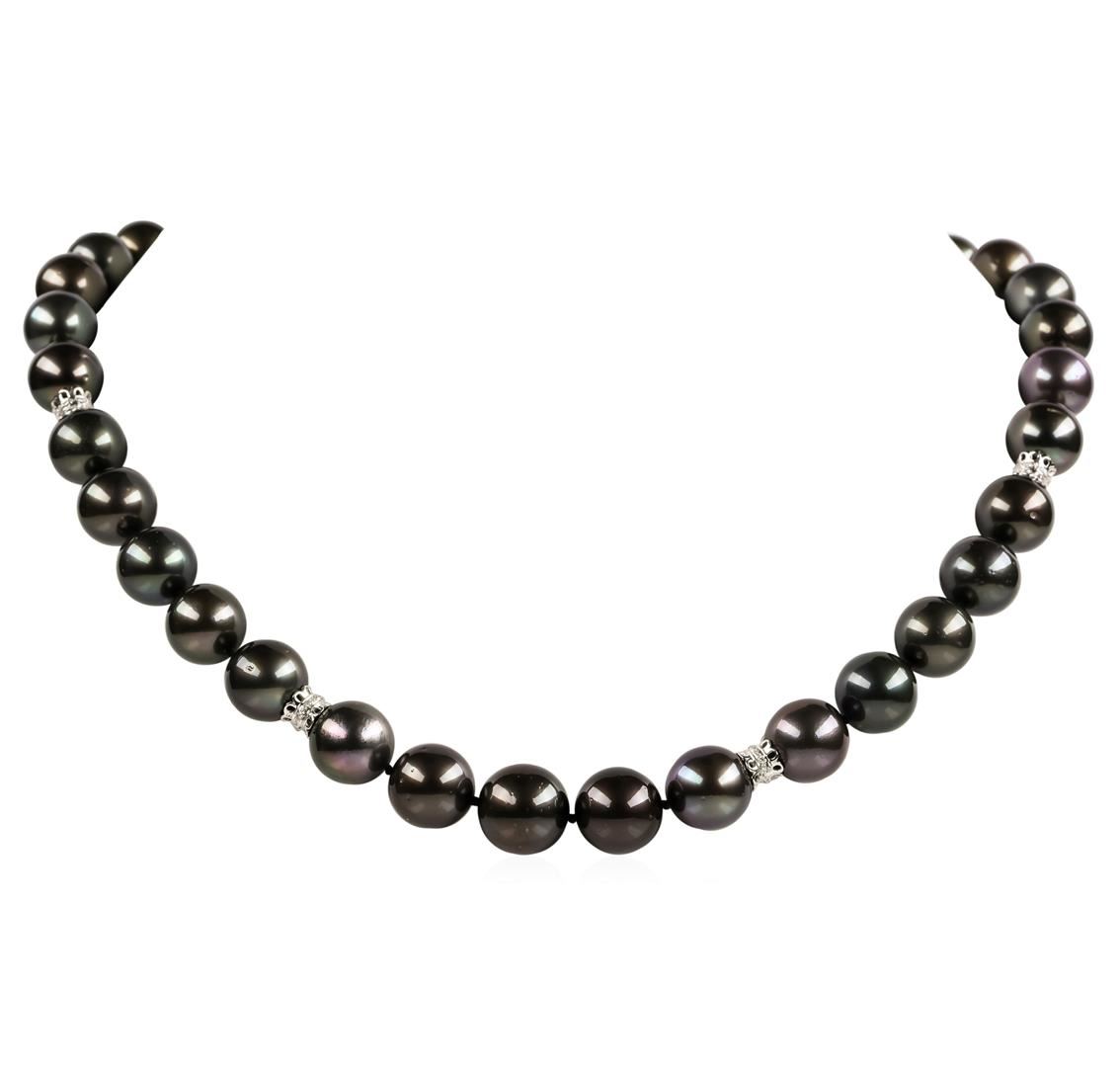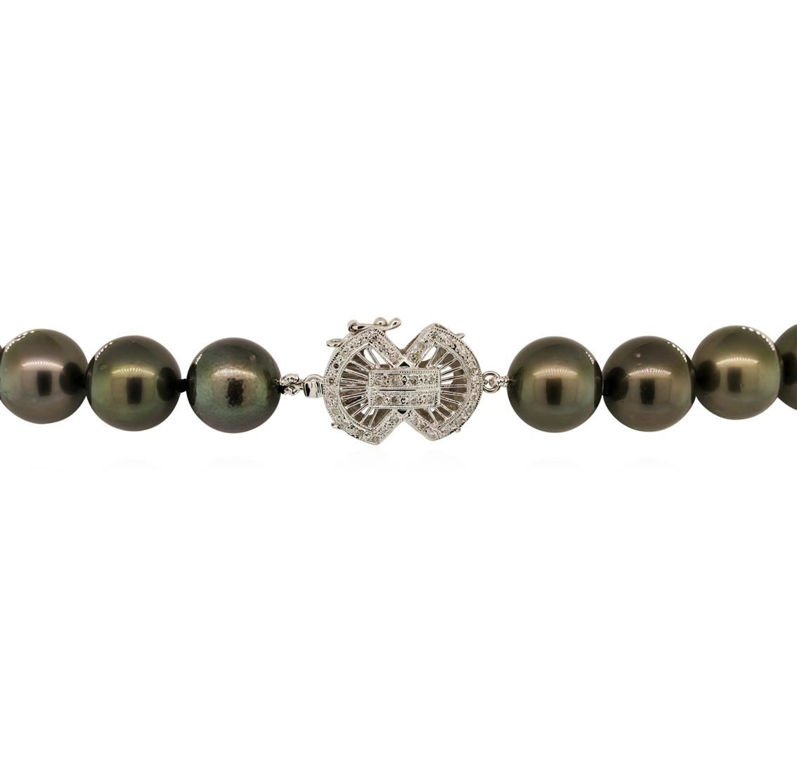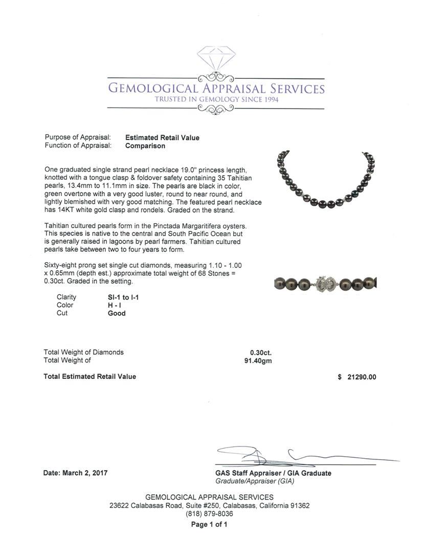 One graduated single strand pearl necklace 19.0' princess length, knotted with a tongue clasp & foldover safety containing 35 Tahitian pearls, 13.4mm to 11.1mm in size. The pearls are black in color, green overtone with a very good luster, round to near round, and lightly blemished with very good matching. The featured pearl necklace has 14KT white gold clasp and rondels. Graded on the strand.Tahitian cultured pearls form in the Pinctada Margaritifera oysters. This species is native to the central and South Pacific Ocean but is generally raised in lagoons by pearl farmers. Tahitian cultured pearls take between two to four years to form. Sixty-Eight prong set single cut diamonds, measuring 1.10 - 1.00 x 0.65mm (depth est.) approximate total weight of 68 Stones = 0.30ct. Graded in the setting. Color H - I Clarity SI-1 to I-1 Cut Good. Total Weight of Diamonds 0.30ct.. Total Weight of 91.40gm GAS Appraised at $21,290.00.