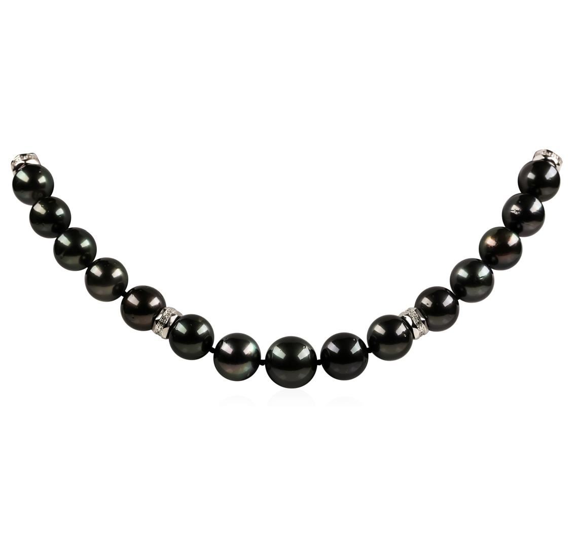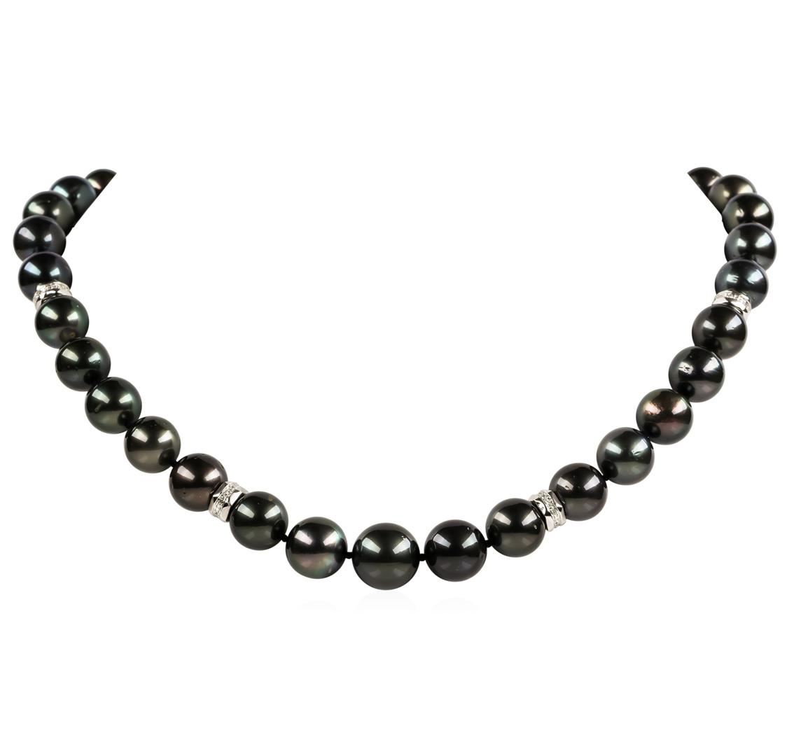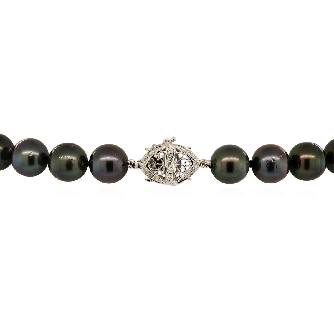 One graduated single strand pearl necklace 18.5' princess length, knotted with a tongue clasp & foldover safety containing 35 Tahitian pearls, 13.9mm to 11.0mm in size. The pearls are black in color, green overtone with a good luster, round to near round, and mostly clean with very good matching. The featured pearl necklace has 14KT white gold clasp and rondels. Graded on the strand.Tahitian cultured pearls form in the Pinctada Margaritifera oysters. This species is native to the central and South Pacific Ocean but is generally raised in lagoons by pearl farmers. Tahitian cultured pearls take between two to four years to form. Forty-Four prong set single cut diamonds, measuring 1.10 - 1.00 x 0.65mm (depth est.) approximate total weight of 44 Stones = 0.19ct. Graded in the setting. Color G - H Clarity SI-1 to I-1 Cut Good. Total Weight of Diamonds 0.19ct.. Total Weight of 87.80gm GAS Appraised at $25,200.00.