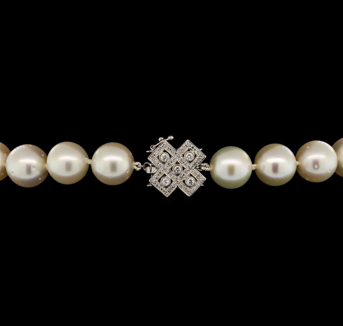 One graduated single strand pearl necklace 19.5' princess length, knotted with a tongue clasp & foldover safety containing 33 south sea cultured pearls, 14.8mm to 12.1mm in size. The pearls are light cream in color with a good luster, round to near round, and moderately blemished with very good matching. The featured pearl necklace has 14KT yellow gold clasp and rondels. The featured pearls have a light rose overtone. Graded on the strand.South Sea cultured pearls are farmed in the oceans surrounding Australia, Indonesia, the Philippines and the southern coast of China. The main source of Australian South Sea pearls lies in the northwest on the Kimberly coast. South Sea cultured pearls are formed in the Pinctada Maxima oyster. These pearls take between two to three years to grow and have a unique nacre due to the fast moving and clean waters of the South Seas. Five bezel set round brilliant cut diamonds, measuring 2.20 - 2.10 x 1.33mm (depth est.) approximate total weight of 5 Stones = 0.20ct. Graded in the setting. Color H - I Clarity SI-1 to SI-2 Cut Very Good One Hundred Sixteen prong set single cut diamonds, measuring 1.10 - 1.00 x 0.65mm (depth est.) approximate total weight of 116 Stones = 0.50ct. Graded in the setting. Color G - I Clarity SI-1 to I-1 Cut Good. Total Weight of Diamonds 0.70ct.. Total Weight of 108.80gm GAS Appraised at $31,420.00.