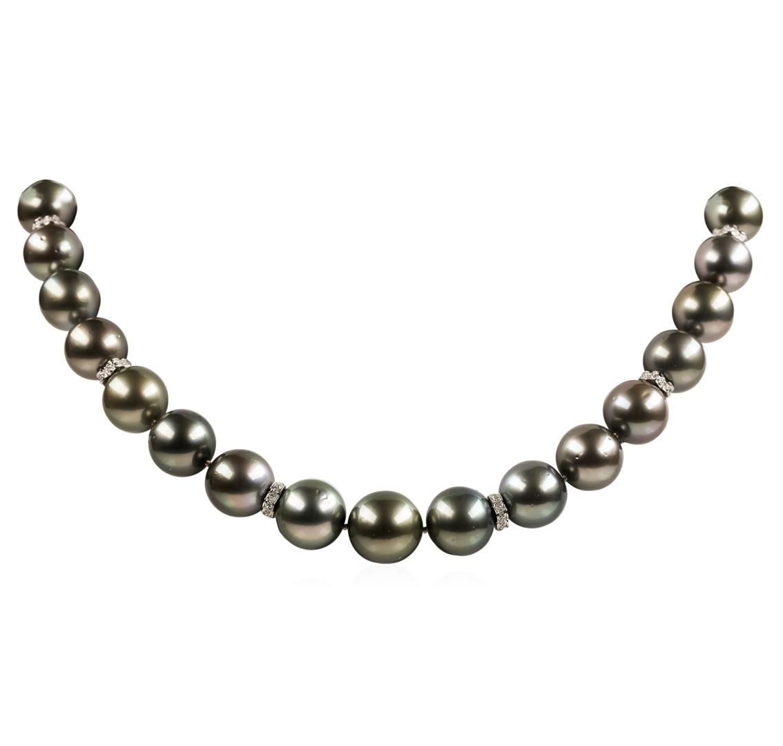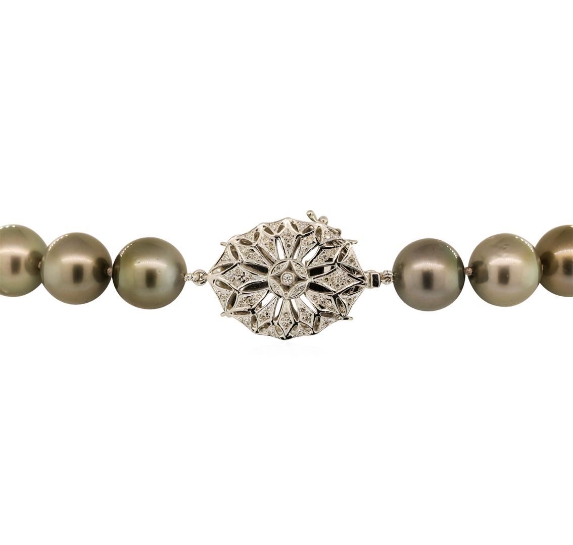 One graduated single strand pearl necklace 18.5' princess length, knotted with a tongue clasp & foldover safety containing 31 Tahitian pearls, 14.9mm to 12.0mm in size. The pearls are silver in color, green overtone with a good luster, round to near round, and mostly clean with very good matching. The featured pearl necklace has 14KT white gold clasp and rondels. Graded on the strand.Tahitian cultured pearls form in the Pinctada Margaritifera oysters. This species is native to the central and South Pacific Ocean but is generally raised in lagoons by pearl farmers. Tahitian cultured pearls take between two to four years to form. One bezel set round brilliant cut diamond, measuring 1.80 - 1.75 x 1.07mm (depth est.) approximate weight of 0.02ct. Graded in the setting. Color H Clarity SI-1 Cut Very Good Eighty-Two prong set single cut diamonds, measuring 1.10 - 1.00 x 0.65mm (depth est.) approximate total weight of 82 Stones = 0.36ct. Graded in the setting. Color G - I Clarity SI-1 to I-1 Cut Good. Total Weight of Diamonds 0.38ct.. Total Weight of 110.30gm GAS Appraised at $34,185.00.