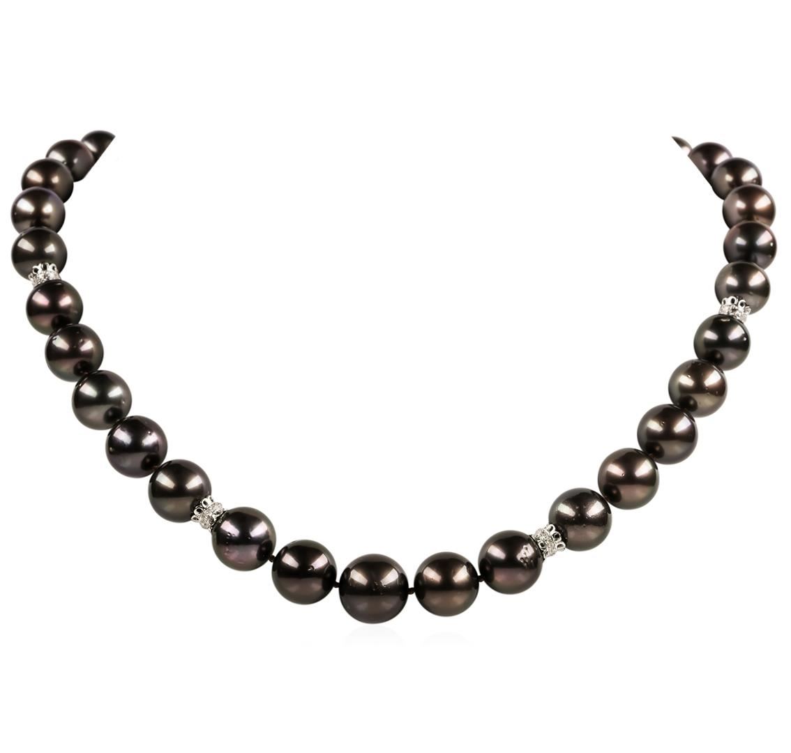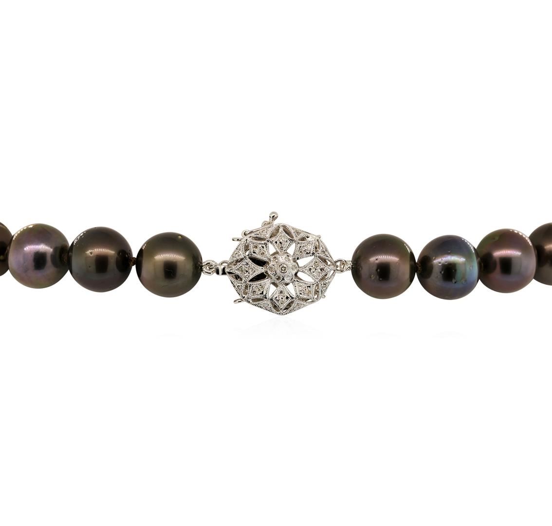 One graduated single strand pearl necklace 19.0' princess length, knotted with a tongue clasp & foldover safety containing 35 Tahitian pearls, 14.2mm to 11.0mm in size. The pearls are black in color, ros� overtone with a good luster, round to near round, and lightly blemished with very good matching. The featured pearl necklace has black pearls with rose and green overtones and 14KT white gold clasp and rondels. Graded on the strand.Tahitian cultured pearls form in the Pinctada Margaritifera oysters. This species is native to the central and South Pacific Ocean but is generally raised in lagoons by pearl farmers. Tahitian cultured pearls take between two to four years to form. One bezel set round brilliant cut diamond, measuring 1.60 - 1.55 x 0.98mm (depth est.) approximate weight of 0.02ct. Graded in the setting. Color H Clarity SI-1 Cut Good Sixty-Six prong set single cut diamonds, measuring 1.10 - 1.00 x 0.65mm (depth est.) approximate total weight of 66 Stones = 0.29ct. Graded in the setting. Color G - H Clarity SI-1 to SI-3 Cut Good. Total Weight of Diamonds 0.31ct.. Total Weight of 95.10gm GAS Appraised at $20,935.00.