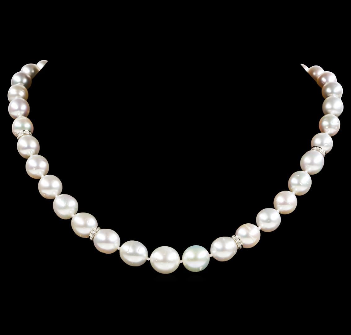 One graduated single strand pearl necklace 18.0' princess length, knotted with a tongue clasp & foldover safety containing 37 south sea cultured pearls, 12.0mm to 9.2mm in size. The pearls are white in color with a good luster, off round, and moderately blemished with good matching. The featured pearl necklace has 14KT white gold clasp and rondels. Graded on the strand.South Sea cultured pearls are farmed in the oceans surrounding Australia, Indonesia, the Philippines and the southern coast of China. The main source of Australian South Sea pearls lies in the northwest on the Kimberly coast. South Sea cultured pearls are formed in the Pinctada Maxima oyster. These pearls take between two to three years to grow and have a unique nacre due to the fast moving and clean waters of the South Seas. Eighty-Four prong set single cut diamonds, measuring 1.10 - 1.00 x 0.65mm (depth est.) approximate total weight of 84 Stones = 0.36ct. Graded in the setting. Color G - H Clarity SI-1 to I-1 Cut Good. Total Weight of Diamonds 0.36ct.. Total Weight of 63.50gm GAS Appraised at $13,395.00.