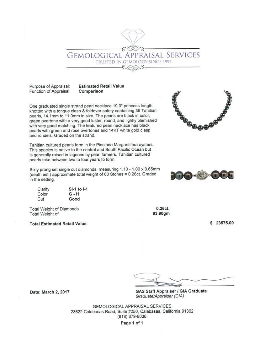 One graduated single strand pearl necklace 19.0' princess length, knotted with a tongue clasp & foldover safety containing 35 Tahitian pearls, 14.1mm to 11.0mm in size. The pearls are black in color, green overtone with a very good luster, round, and lightly blemished with very good matching. The featured pearl necklace has black pearls with green and rose overtones and 14KT white gold clasp and rondels. Graded on the strand.Tahitian cultured pearls form in the Pinctada Margaritifera oysters. This species is native to the central and South Pacific Ocean but is generally raised in lagoons by pearl farmers. Tahitian cultured pearls take between two to four years to form. Sixty prong set single cut diamonds, measuring 1.10 - 1.00 x 0.65mm (depth est.) approximate total weight of 60 Stones = 0.26ct. Graded in the setting. Color G - H Clarity SI-1 to I-1 Cut Good. Total Weight of Diamonds 0.26ct.. Total Weight of 93.90gm GAS Appraised at $23,575.00.