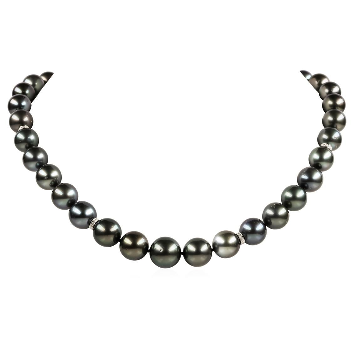 One graduated single strand pearl necklace 19.0' princess length, knotted with a tongue clasp & foldover safety containing 35 Tahitian pearls, 14.7mm to 11.0mm in size. The pearls are black in color, green overtone with a good luster, round to near round, and lightly blemished with very good matching. The featured pearl necklace has 14KT white gold clasp and rondels. Graded on the strand.Tahitian cultured pearls form in the Pinctada Margaritifera oysters. This species is native to the central and South Pacific Ocean but is generally raised in lagoons by pearl farmers. Tahitian cultured pearls take between two to four years to form. Seventy-Six prong set single cut diamonds, measuring 1.10 - 1.00 x 0.65mm (depth est.) approximate total weight of 76 Stones = 0.33ct. Graded in the setting. Color G - H Clarity SI-1 to I-1 Cut Good. Total Weight of Diamonds 0.33ct.. Total Weight of 94.50gm GAS Appraised at $21,070.00.