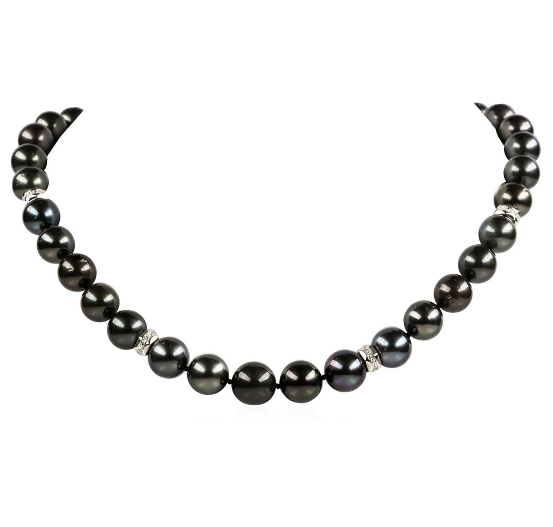One graduated single strand pearl necklace 19.0' princess length, knotted with a tongue clasp & foldover safety containing 35 Tahitian pearls, 13.4mm to 11.0mm in size. The pearls are black in color, green overtone with a very good luster, round to near round, and moderately blemished with very good matching. The featured pearl necklace has 14KT white gold clasp and rondels. Graded on the strand.Tahitian cultured pearls form in the Pinctada Margaritifera oysters. This species is native to the central and South Pacific Ocean but is generally raised in lagoons by pearl farmers. Tahitian cultured pearls take between two to four years to form. Fifty-Two prong set single cut diamonds, measuring 1.10 - 1.00 x 0.65mm (depth est.) approximate total weight of 52 Stones = 0.23ct. Graded in the setting. Color G - H Clarity SI-1 to SI-2 Cut Good. Total Weight of Diamonds 0.23ct.. Total Weight of 92.70gm GAS Appraised at $22,120.00.
