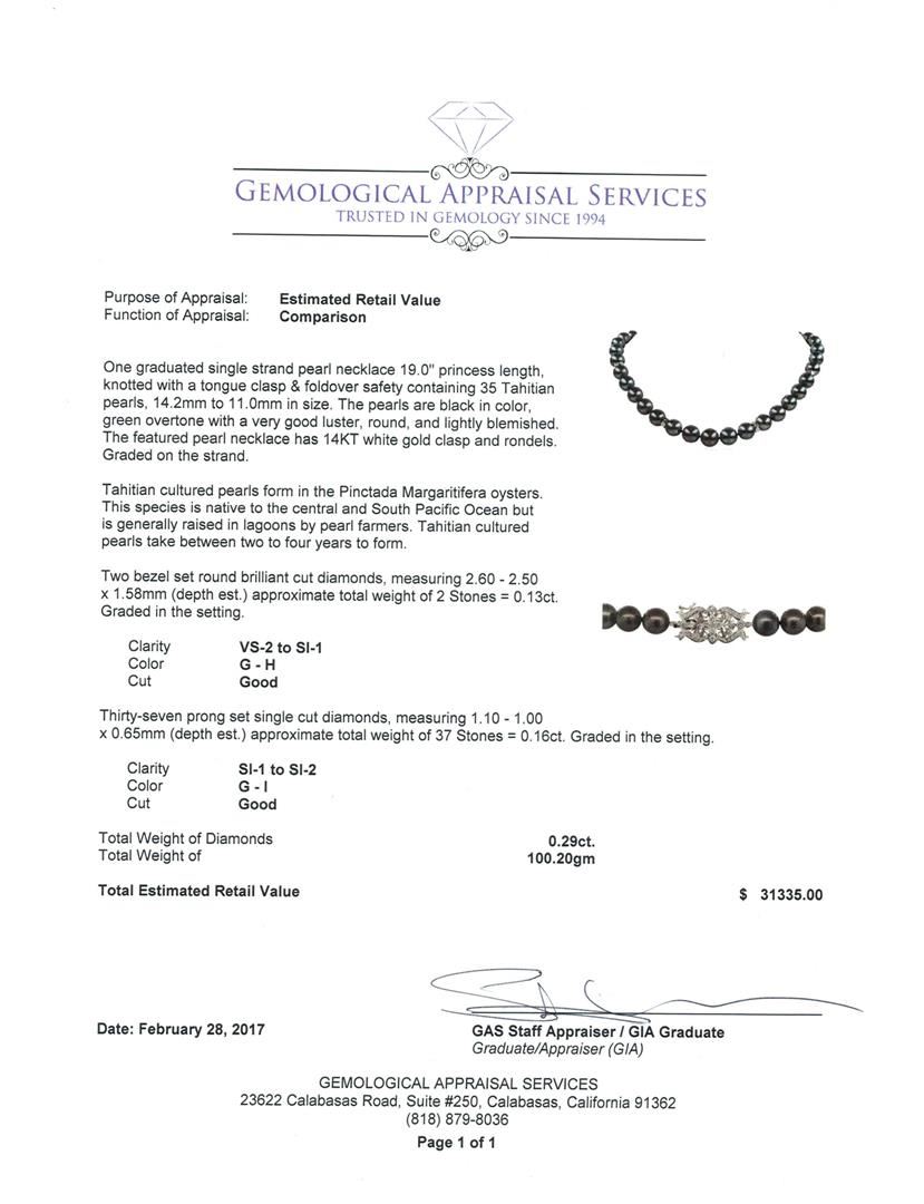 One graduated single strand pearl necklace 19.0' princess length, knotted with a tongue clasp & foldover safety containing 35 Tahitian pearls, 14.2mm to 11.0mm in size. The pearls are black in color, green overtone with a very good luster, round, and lightly blemished. The featured pearl necklace has 14KT white gold clasp and rondels. Graded on the strand.Tahitian cultured pearls form in the Pinctada Margaritifera oysters. This species is native to the central and South Pacific Ocean but is generally raised in lagoons by pearl farmers. Tahitian cultured pearls take between two to four years to form. Two bezel set round brilliant cut diamonds, measuring 2.60 - 2.50 x 1.58mm (depth est.) approximate total weight of 2 Stones = 0.13ct. Graded in the setting. Color G - H Clarity VS-2 to SI-1 Cut Good Thirty-Seven prong set single cut diamonds, measuring 1.10 - 1.00 x 0.65mm (depth est.) approximate total weight of 37 Stones = 0.16ct. Graded in the setting. Color G - I Clarity SI-1 to SI-2 Cut Good. Total Weight of Diamonds 0.29ct.. Total Weight of 100.20gm GAS Appraised at $31,335.00.