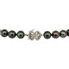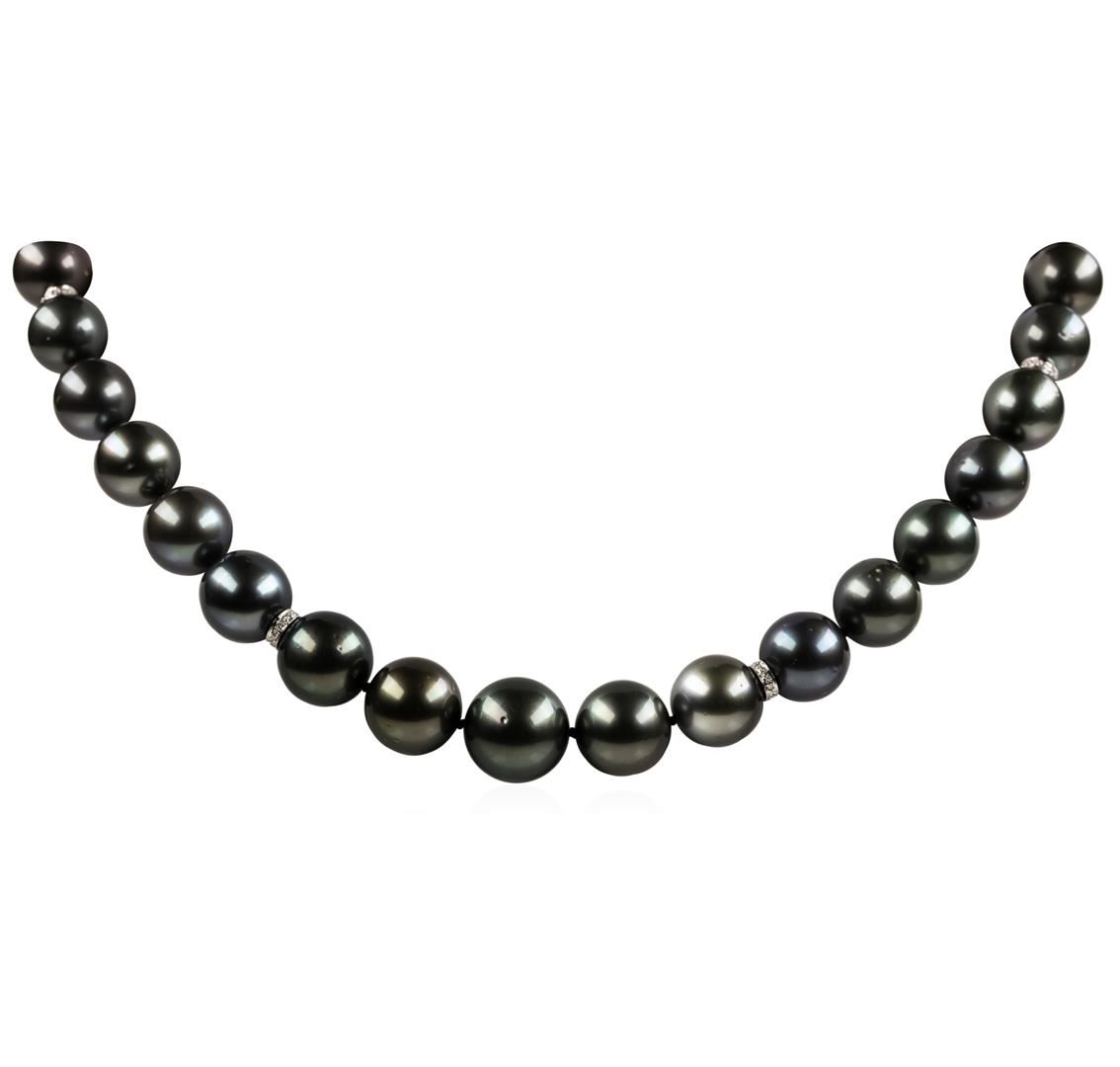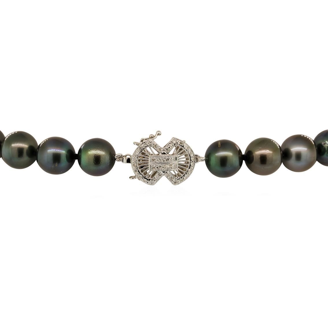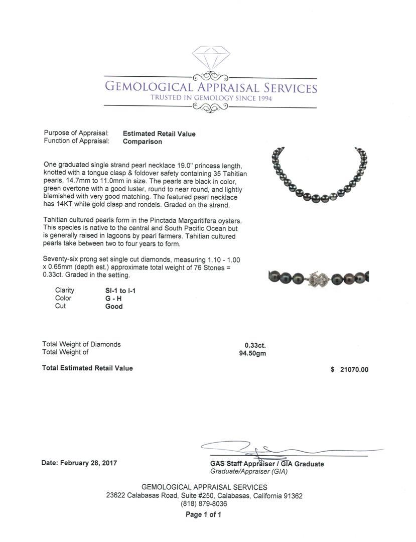 One graduated single strand pearl necklace 19.0' princess length, knotted with a tongue clasp & foldover safety containing 35 Tahitian pearls, 14.7mm to 11.0mm in size. The pearls are black in color, green overtone with a good luster, round to near round, and lightly blemished with very good matching. The featured pearl necklace has 14KT white gold clasp and rondels. Graded on the strand.Tahitian cultured pearls form in the Pinctada Margaritifera oysters. This species is native to the central and South Pacific Ocean but is generally raised in lagoons by pearl farmers. Tahitian cultured pearls take between two to four years to form. Seventy-Six prong set single cut diamonds, measuring 1.10 - 1.00 x 0.65mm (depth est.) approximate total weight of 76 Stones = 0.33ct. Graded in the setting. Color G - H Clarity SI-1 to I-1 Cut Good. Total Weight of Diamonds 0.33ct.. Total Weight of 94.50gm GAS Appraised at $21,070.00.