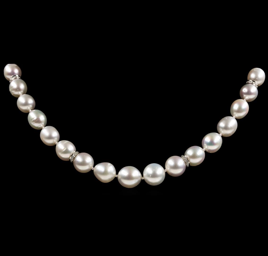 One graduated single strand pearl necklace 18.5' princess length, knotted with a tongue clasp & foldover safety containing 37 south sea cultured pearls, 11.8mm to 9.0mm in size. The pearls are white in color with a very good luster, off round, and moderately blemished with very good matching. The featured pearl necklace has 14KT white gold clasp and rondels. Graded on the strand.South Sea cultured pearls are farmed in the oceans surrounding Australia, Indonesia, the Philippines and the southern coast of China. The main source of Australian South Sea pearls lies in the northwest on the Kimberly coast. South Sea cultured pearls are formed in the Pinctada Maxima oyster. These pearls take between two to three years to grow and have a unique nacre due to the fast moving and clean waters of the South Seas. Seventy-Two prong set single cut diamonds, measuring 1.10 - 1.00 x 0.65mm (depth est.) approximate total weight of 72 Stones = 0.31ct. Graded in the setting. Color H - I Clarity SI-1 to I-1 Cut Good. Total Weight of Diamonds 0.31ct.. Total Weight of 62.30gm GAS Appraised at $14,270.00.