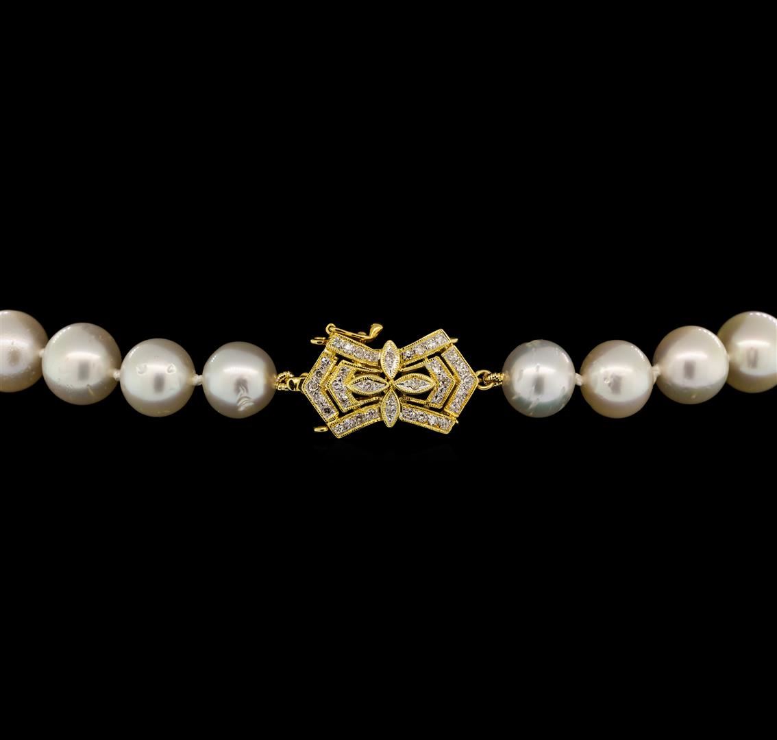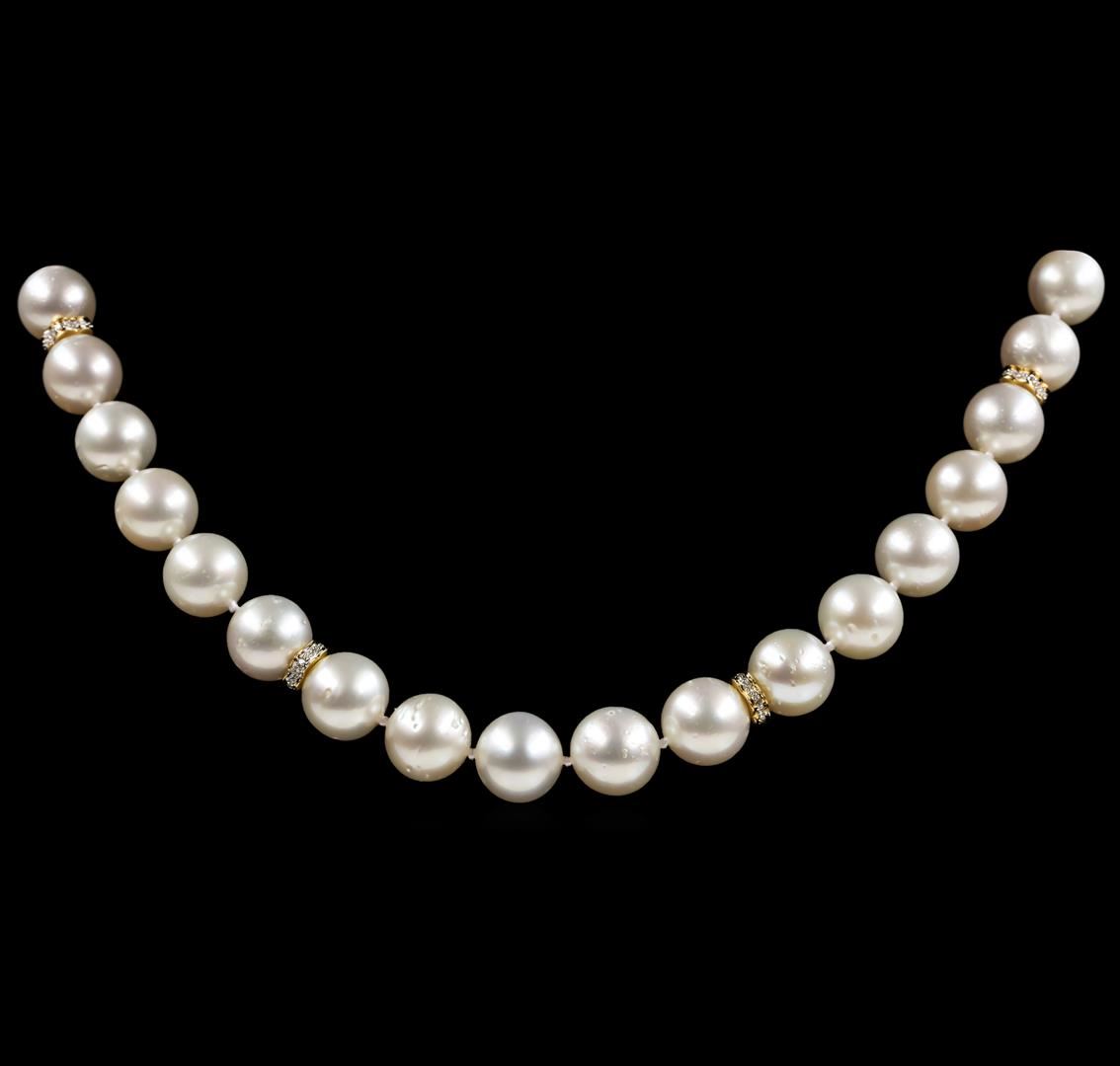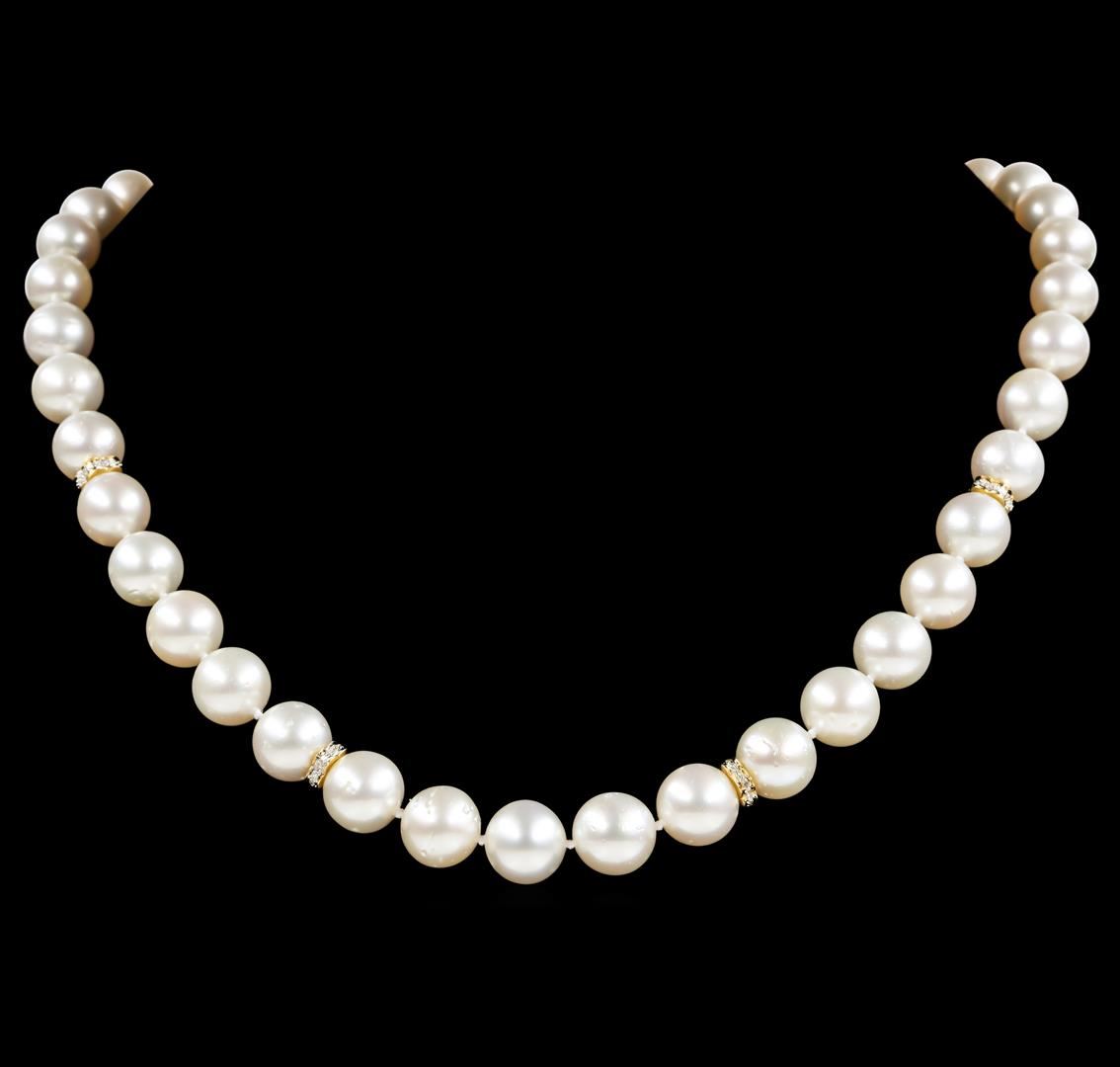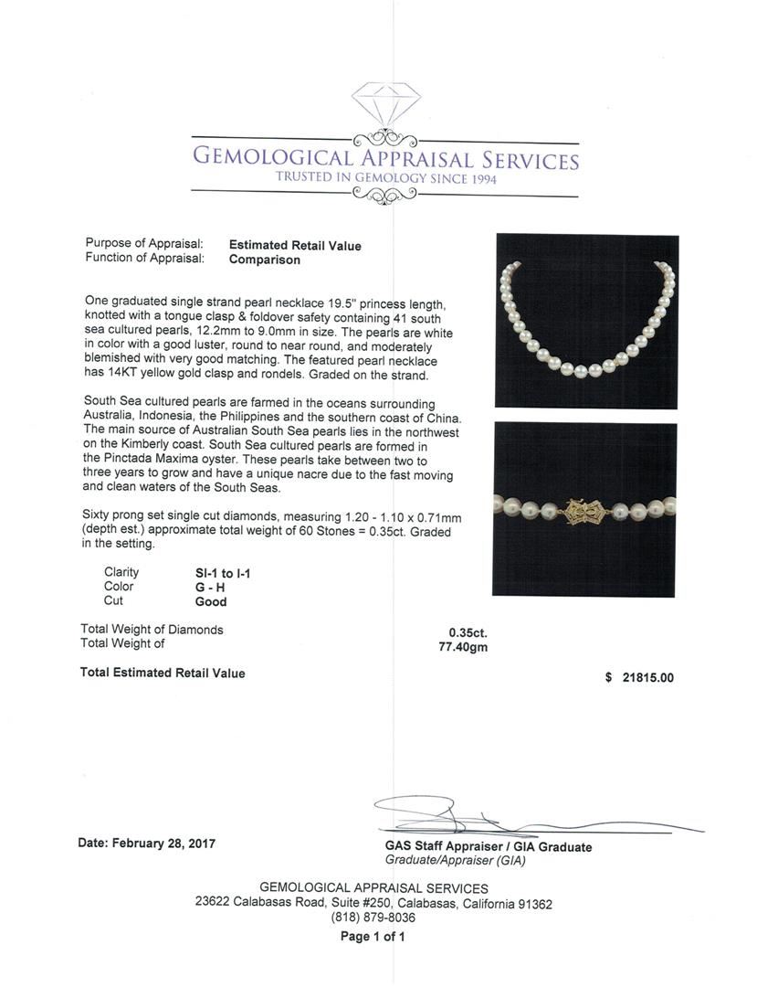 One graduated single strand pearl necklace 19.5' princess length, knotted with a tongue clasp & foldover safety containing 41 south sea cultured pearls, 12.2mm to 9.0mm in size. The pearls are white in color with a good luster, round to near round, and moderately blemished with very good matching. The featured pearl necklace has 14KT yellow gold clasp and rondels. Graded on the strand.South Sea cultured pearls are farmed in the oceans surrounding Australia, Indonesia, the Philippines and the southern coast of China. The main source of Australian South Sea pearls lies in the northwest on the Kimberly coast. South Sea cultured pearls are formed in the Pinctada Maxima oyster. These pearls take between two to three years to grow and have a unique nacre due to the fast moving and clean waters of the South Seas. Sixty prong set single cut diamonds, measuring 1.20 - 1.10 x 0.71mm (depth est.) approximate total weight of 60 Stones = 0.35ct. Graded in the setting. Color G - H Clarity SI-1 to I-1 Cut Good. Total Weight of Diamonds 0.35ct.. Total Weight of 77.40gm GAS Appraised at $21,815.00.
