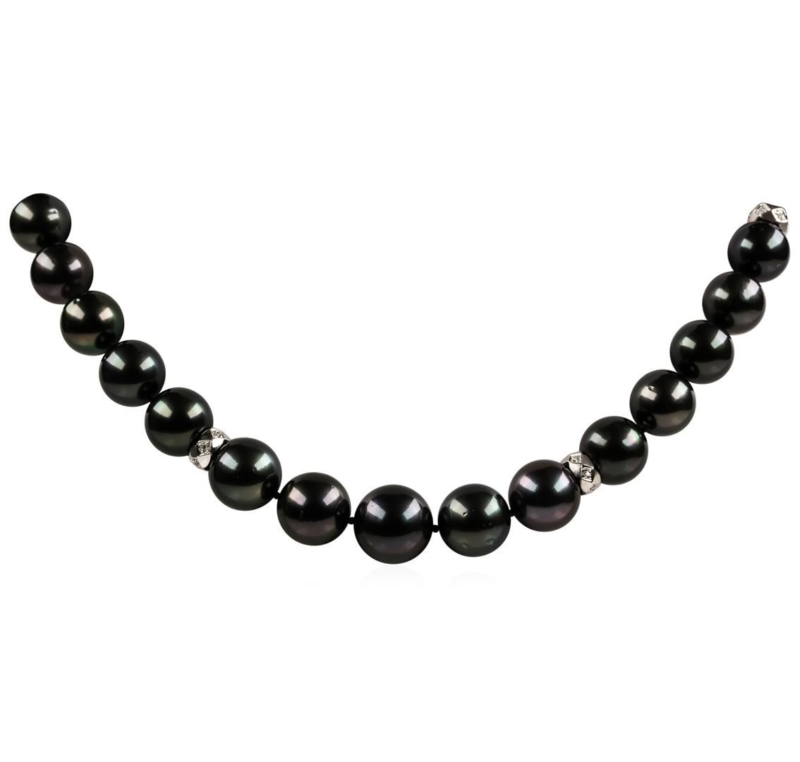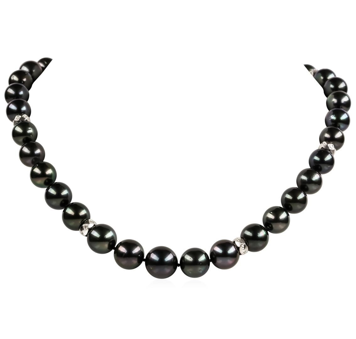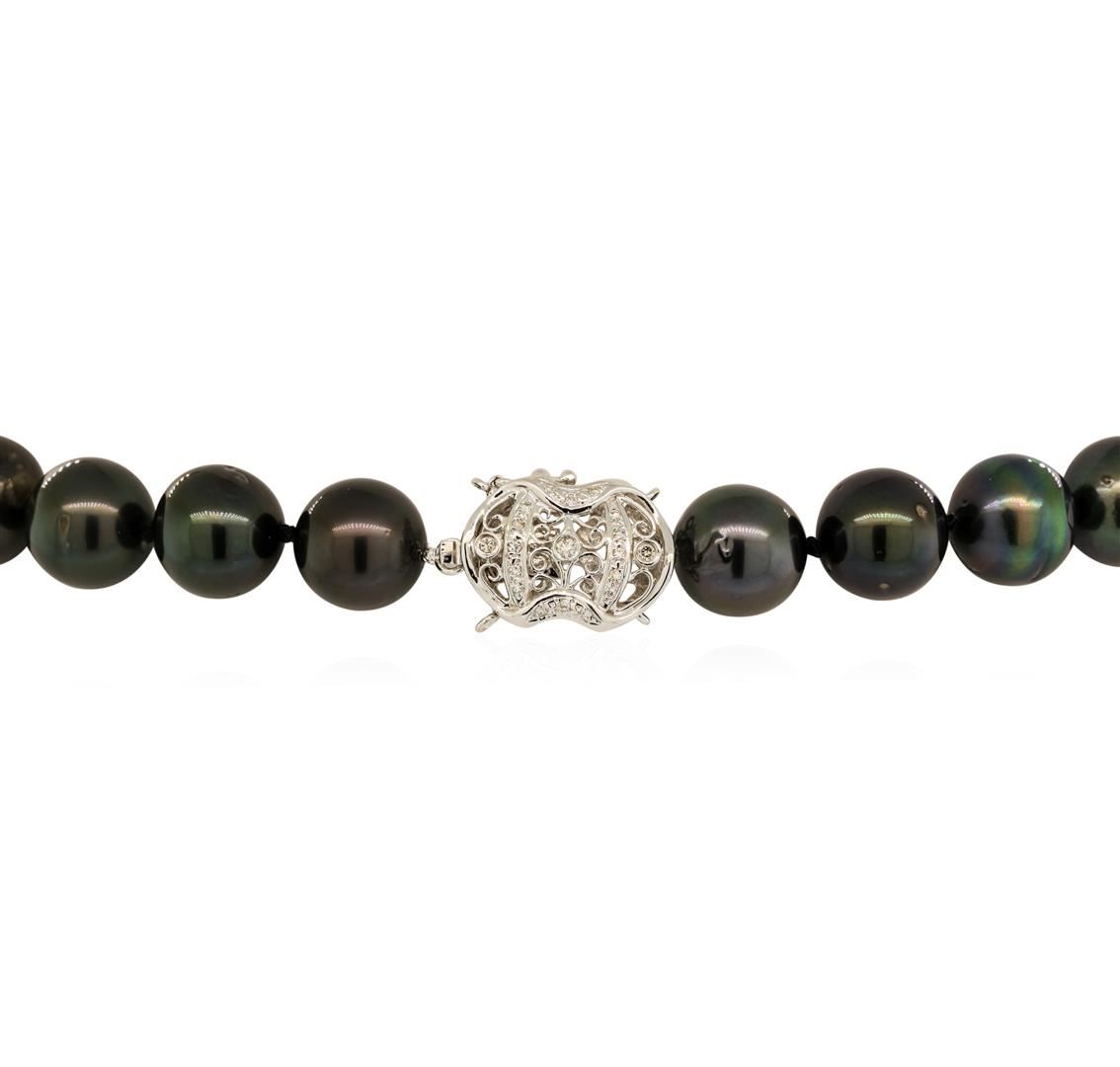 One graduated single strand pearl necklace 19.0' princess length, knotted with a tongue clasp & foldover safety containing 35 Tahitian pearls, 14.7mm to 11.1mm in size. The pearls are black in color, green overtone with a very good luster, round to near round, and lightly blemished with very good matching. The featured pearl necklace has 14KT white gold clasp and rondels. Graded on the strand.Tahitian cultured pearls form in the Pinctada Margaritifera oysters. This species is native to the central and South Pacific Ocean but is generally raised in lagoons by pearl farmers. Tahitian cultured pearls take between two to four years to form. Three bezel set round brilliant cut diamonds, measuring 1.80 - 1.75 x 1.10mm (depth est.) approximate total weight of 3 Stones = 0.06ct. Graded in the setting. Color H Clarity SI-1 to SI-2 Cut Good Fifty-Two prong set single cut diamonds, measuring 1.10 - 1.00 x 0.65mm (depth est.) approximate total weight of 52 Stones = 0.23ct. Graded in the setting. Color G - H Clarity SI-1 to I-1 Cut Good. Total Weight of Diamonds 0.29ct.. Total Weight of 99.70gm GAS Appraised at $23,730.00.