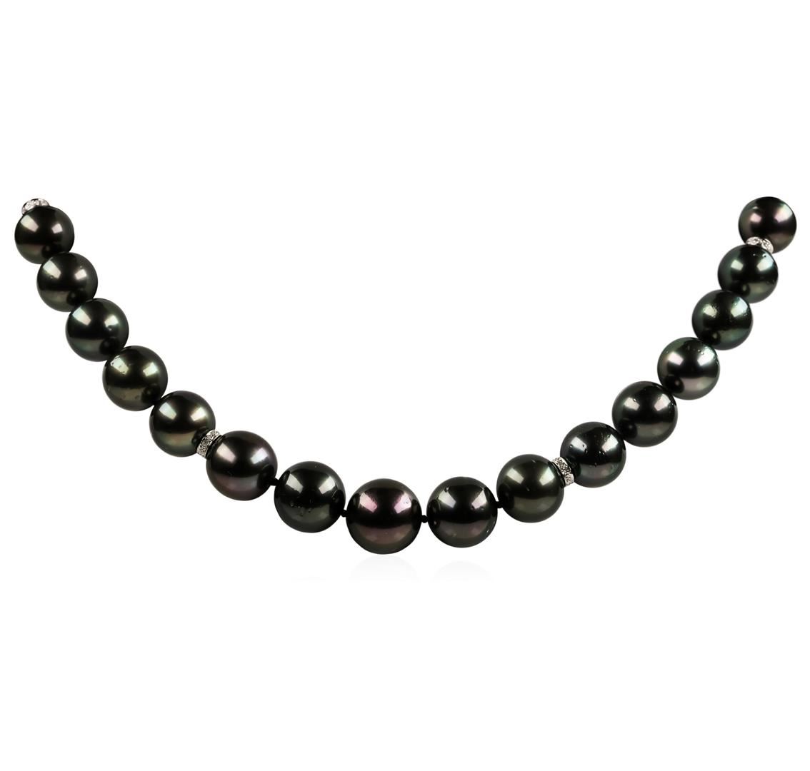 One graduated single strand pearl necklace 19.0' princess length, knotted with a tongue clasp & foldover safety containing 35 Tahitian pearls, 14.4mm to 11.0mm in size. The pearls are black in color, green overtone with a very good luster, round to near round, and moderately blemished with very good matching. The featured pearl necklace has 14KT white gold clasp and rondels. The featured pearls have both green and rose overtones. Graded on the strand.Tahitian cultured pearls form in the Pinctada Margaritifera oysters. This species is native to the central and South Pacific Ocean but is generally raised in lagoons by pearl farmers. Tahitian cultured pearls take between two to four years to form. One bezel set round brilliant cut diamond, measuring 1.70 - 1.65 x 1.04mm (depth est.) approximate weight of 0.02ct. Graded in the setting. Color H Clarity SI-1 Cut Good Seventy-Four prong set single cut diamonds, measuring 1.10 - 1.00 x 0.65mm (depth est.) approximate total weight of 74 Stones = 0.32ct. Graded in the setting. Color H - I Clarity SI-1 to I-1 Cut Good. Total Weight of Diamonds 0.34ct.. Total Weight of 94.00gm GAS Appraised at $21,175.00.