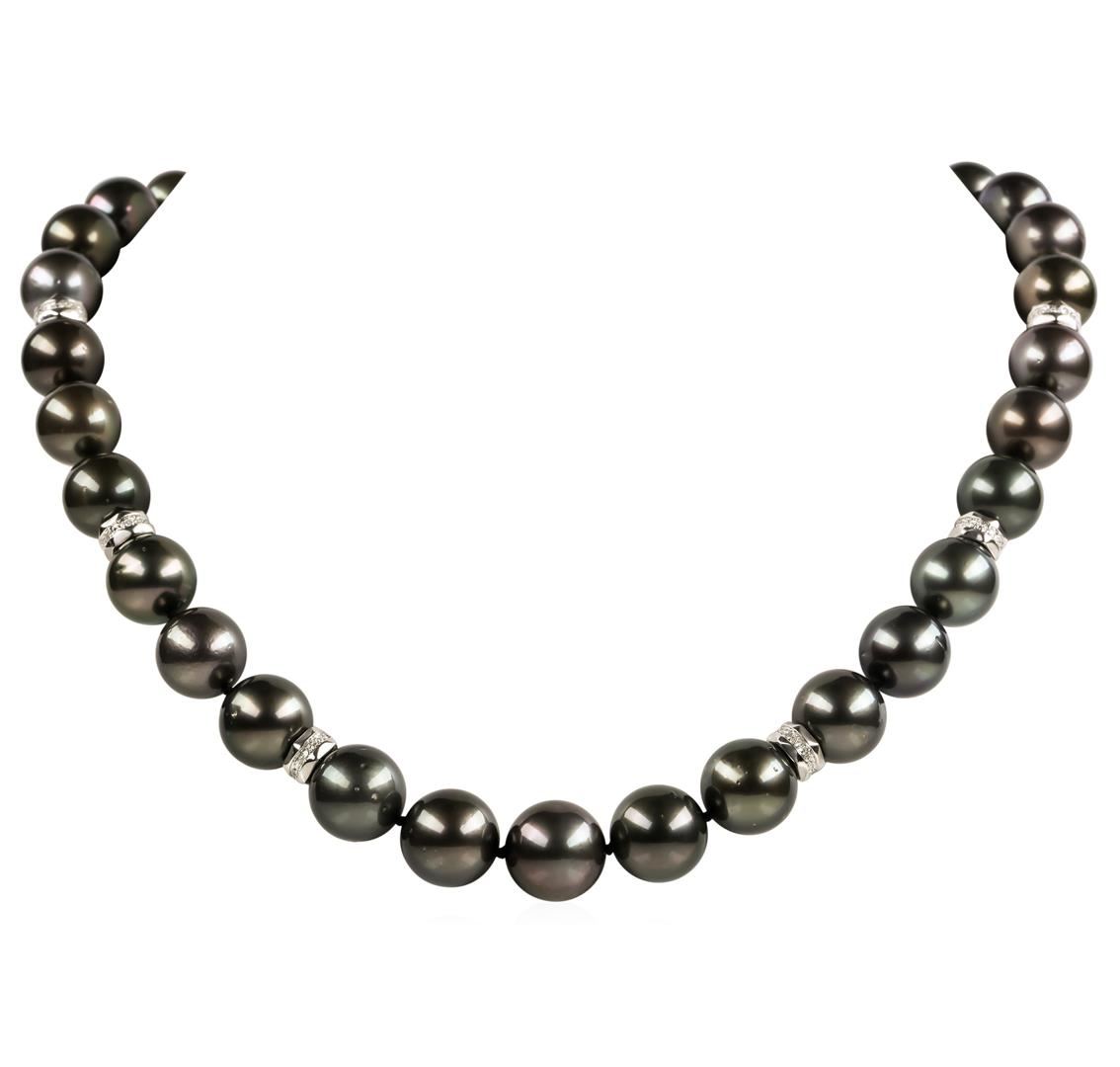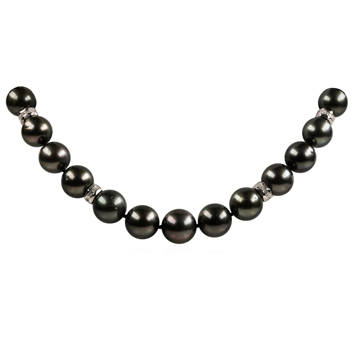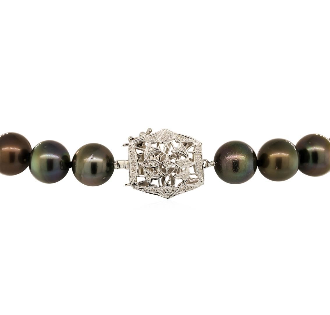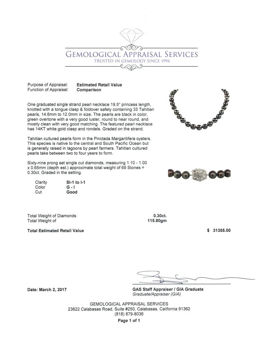 One graduated single strand pearl necklace 19.5' princess length, knotted with a tongue clasp & foldover safety containing 33 Tahitian pearls, 14.6mm to 12.0mm in size. The pearls are black in color, green overtone with a very good luster, round to near round, and mostly clean with very good matching. The featured pearl necklace has 14KT white gold clasp and rondels. Graded on the strand.Tahitian cultured pearls form in the Pinctada Margaritifera oysters. This species is native to the central and South Pacific Ocean but is generally raised in lagoons by pearl farmers. Tahitian cultured pearls take between two to four years to form. Sixty-Nine prong set single cut diamonds, measuring 1.10 - 1.00 x 0.65mm (depth est.) approximate total weight of 69 Stones = 0.30ct. Graded in the setting. Color G - I Clarity SI-1 to I-1 Cut Good. Total Weight of Diamonds 0.30ct.. Total Weight of 115.80gm GAS Appraised at $31,355.00.