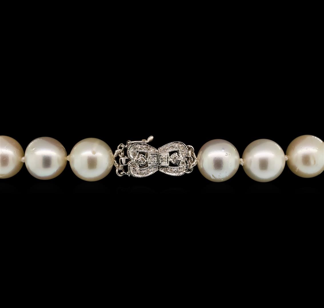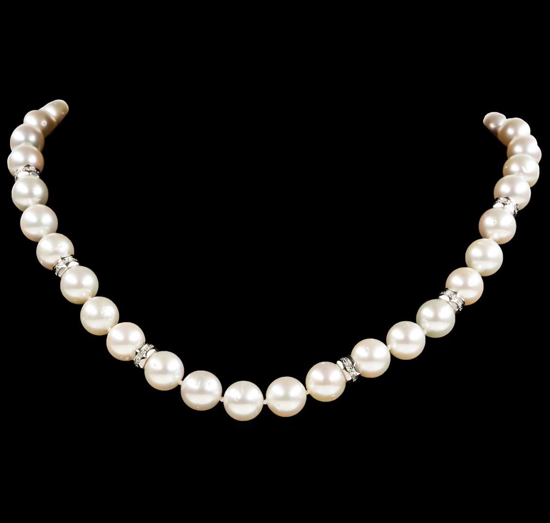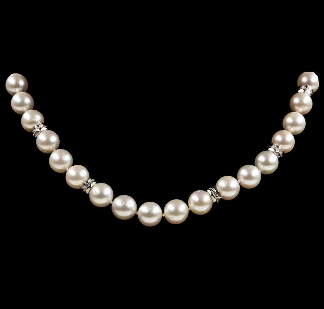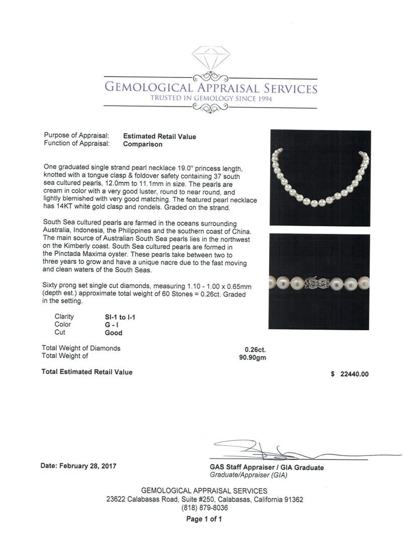 One graduated single strand pearl necklace 19.0' princess length, knotted with a tongue clasp & foldover safety containing 37 south sea cultured pearls, 12.0mm to 11.1mm in size. The pearls are cream in color with a very good luster, round to near round, and lightly blemished with very good matching. The featured pearl necklace has 14KT white gold clasp and rondels. Graded on the strand.South Sea cultured pearls are farmed in the oceans surrounding Australia, Indonesia, the Philippines and the southern coast of China. The main source of Australian South Sea pearls lies in the northwest on the Kimberly coast. South Sea cultured pearls are formed in the Pinctada Maxima oyster. These pearls take between two to three years to grow and have a unique nacre due to the fast moving and clean waters of the South Seas. Sixty prong set single cut diamonds, measuring 1.10 - 1.00 x 0.65mm (depth est.) approximate total weight of 60 Stones = 0.26ct. Graded in the setting. Color G - I Clarity SI-1 to I-1 Cut Good. Total Weight of Diamonds 0.26ct.. Total Weight of 90.90gm GAS Appraised at $22,440.00.