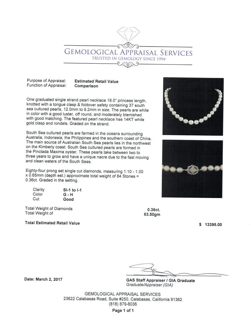 One graduated single strand pearl necklace 18.0' princess length, knotted with a tongue clasp & foldover safety containing 37 south sea cultured pearls, 12.0mm to 9.2mm in size. The pearls are white in color with a good luster, off round, and moderately blemished with good matching. The featured pearl necklace has 14KT white gold clasp and rondels. Graded on the strand.South Sea cultured pearls are farmed in the oceans surrounding Australia, Indonesia, the Philippines and the southern coast of China. The main source of Australian South Sea pearls lies in the northwest on the Kimberly coast. South Sea cultured pearls are formed in the Pinctada Maxima oyster. These pearls take between two to three years to grow and have a unique nacre due to the fast moving and clean waters of the South Seas. Eighty-Four prong set single cut diamonds, measuring 1.10 - 1.00 x 0.65mm (depth est.) approximate total weight of 84 Stones = 0.36ct. Graded in the setting. Color G - H Clarity SI-1 to I-1 Cut Good. Total Weight of Diamonds 0.36ct.. Total Weight of 63.50gm GAS Appraised at $13,395.00.