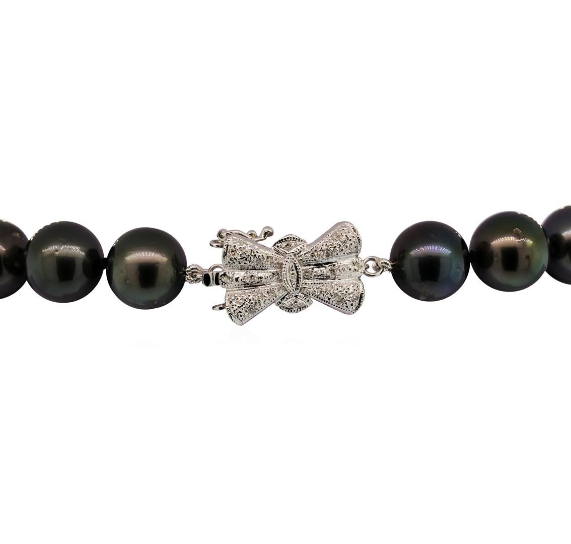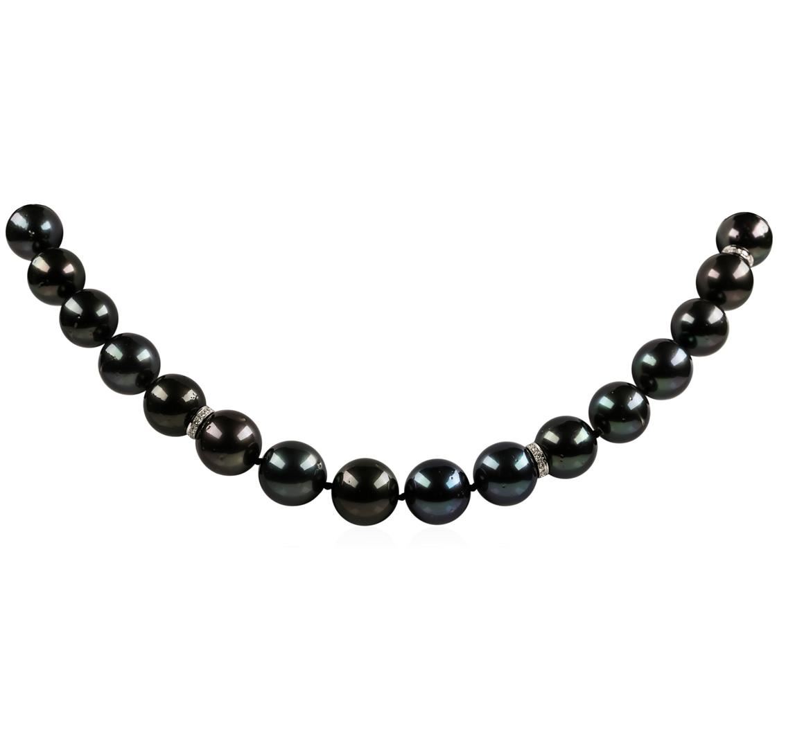 One graduated single strand pearl necklace 19.0' princess length, knotted with a tongue clasp & foldover safety containing 35 Tahitian pearls, 13.2mm to 11.1mm in size. The pearls are black in color, green overtone with a good luster, round to near round, and lightly blemished with very good matching. The featured pearl necklace has 14KT white gold clasp and rondels. Graded on the strand.Tahitian cultured pearls form in the Pinctada Margaritifera oysters. This species is native to the central and South Pacific Ocean but is generally raised in lagoons by pearl farmers. Tahitian cultured pearls take between two to four years to form. Sixty-Five prong set single cut diamonds, measuring 1.10 - 1.00 x 0.65mm (depth est.) approximate total weight of 65 Stones = 0.28ct. Graded in the setting. Color G - H Clarity SI-1 to SI-2 Cut Good. Total Weight of Diamonds 0.28ct.. Total Weight of 89.40gm GAS Appraised at $19,060.00.