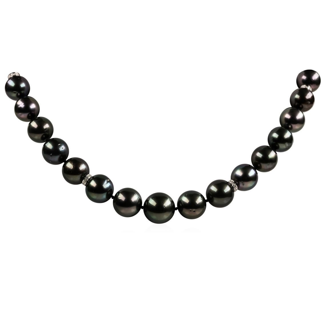 One graduated single strand pearl necklace 19.0' princess length, knotted with a tongue clasp & foldover safety containing 35 Tahitian pearls, 14.6mm to 11.0mm in size. The pearls are black in color, green overtone with a very good luster, round to near round, and lightly blemished with very good matching. The featured pearl necklace has 14KT white gold clasp and rondels. Graded on the strand.Tahitian cultured pearls form in the Pinctada Margaritifera oysters. This species is native to the central and South Pacific Ocean but is generally raised in lagoons by pearl farmers. Tahitian cultured pearls take between two to four years to form. Sixty-Four prong set single cut diamonds, measuring 1.10 - 1.00 x 0.65mm (depth est.) approximate total weight of 64 Stones = 0.28ct. Graded in the setting. Color H - I Clarity SI-1 to I-1 Cut Good. Total Weight of Diamonds 0.28ct.. Total Weight of 93.40gm GAS Appraised at $23,830.00.