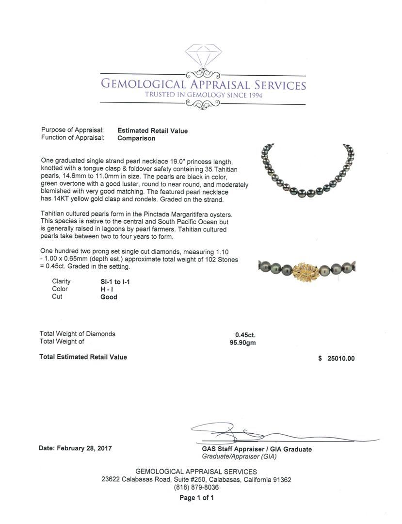 One graduated single strand pearl necklace 19.0' princess length, knotted with a tongue clasp & foldover safety containing 35 Tahitian pearls, 14.6mm to 11.0mm in size. The pearls are black in color, green overtone with a good luster, round to near round, and moderately blemished with very good matching. The featured pearl necklace has 14KT yellow gold clasp and rondels. Graded on the strand.Tahitian cultured pearls form in the Pinctada Margaritifera oysters. This species is native to the central and South Pacific Ocean but is generally raised in lagoons by pearl farmers. Tahitian cultured pearls take between two to four years to form. One Hundred Two prong set single cut diamonds, measuring 1.10 - 1.00 x 0.65mm (depth est.) approximate total weight of 102 Stones = 0.45ct. Graded in the setting. Color H - I Clarity SI-1 to I-1 Cut Good. Total Weight of Diamonds 0.45ct.. Total Weight of 95.90gm GAS Appraised at $25,010.00.