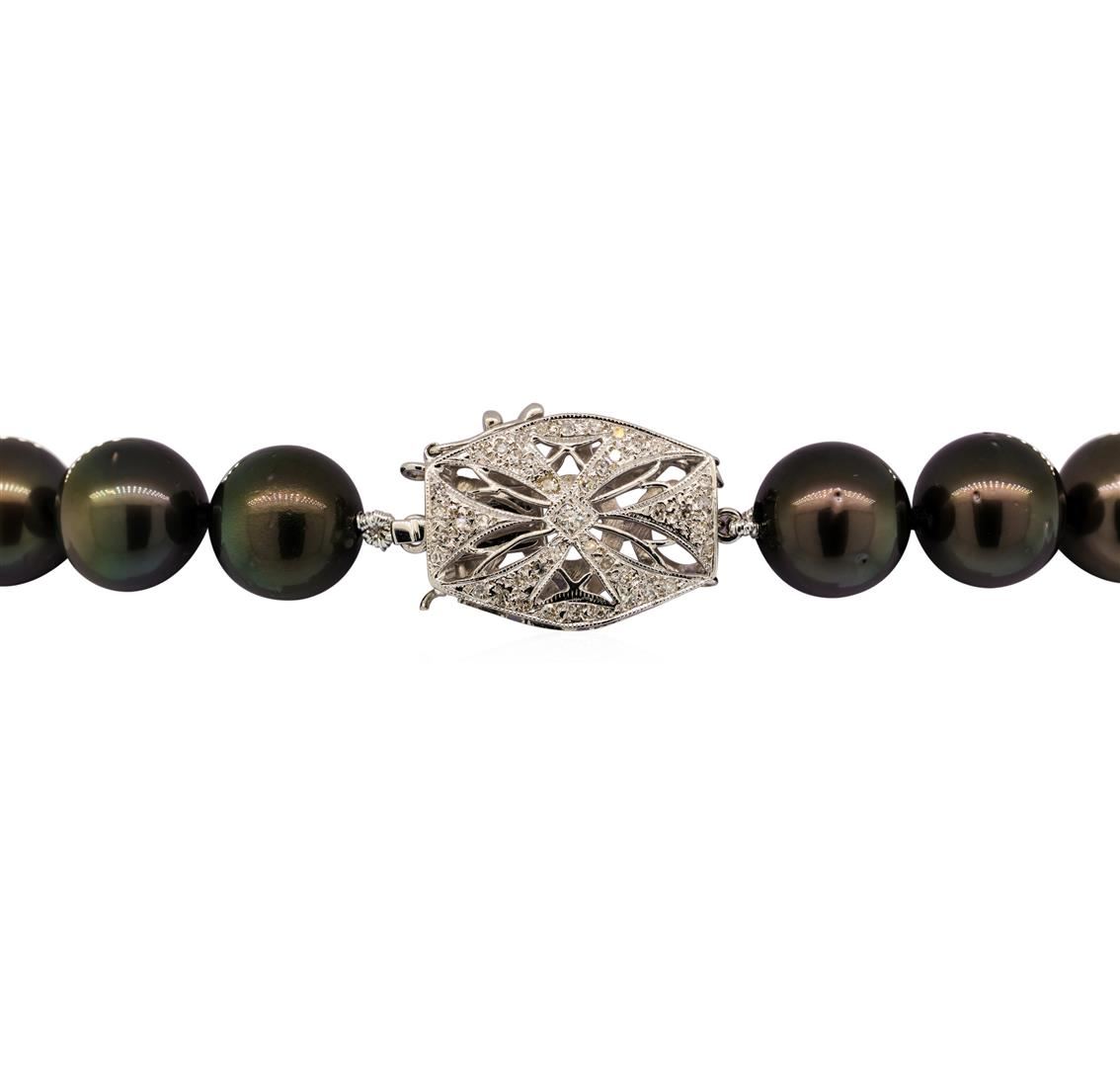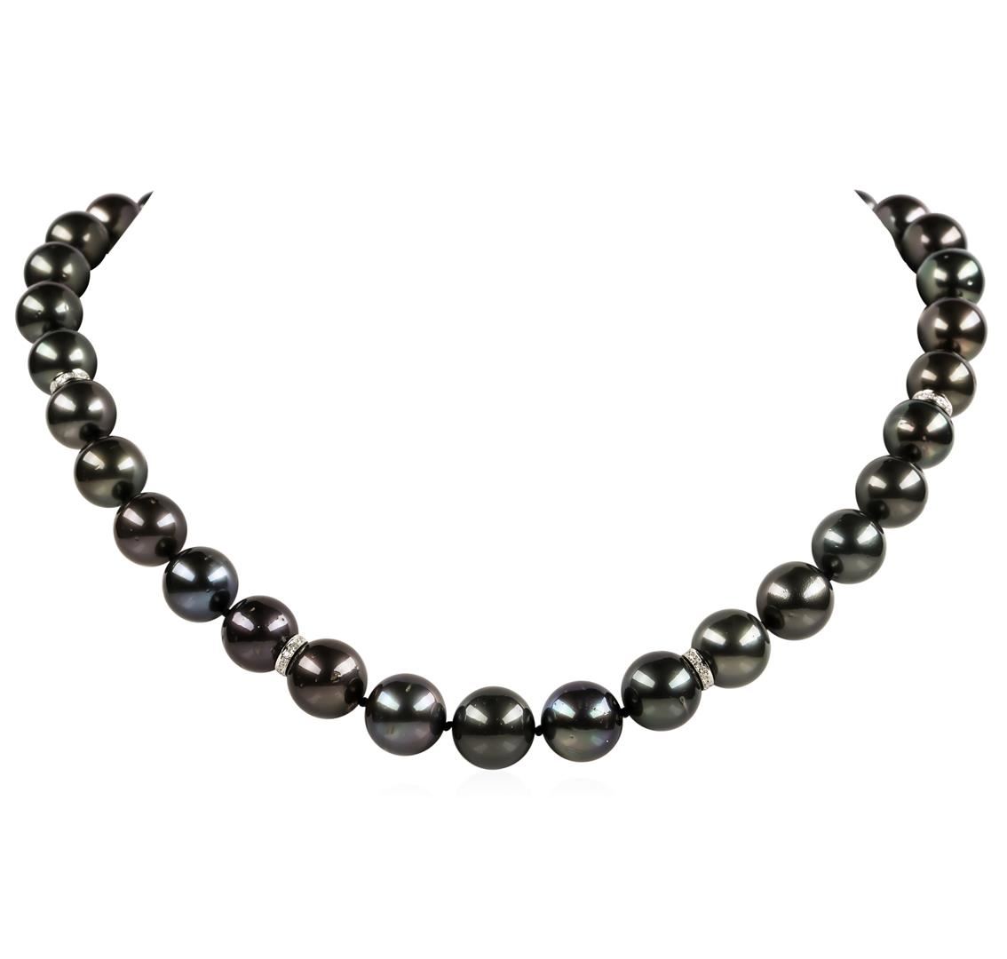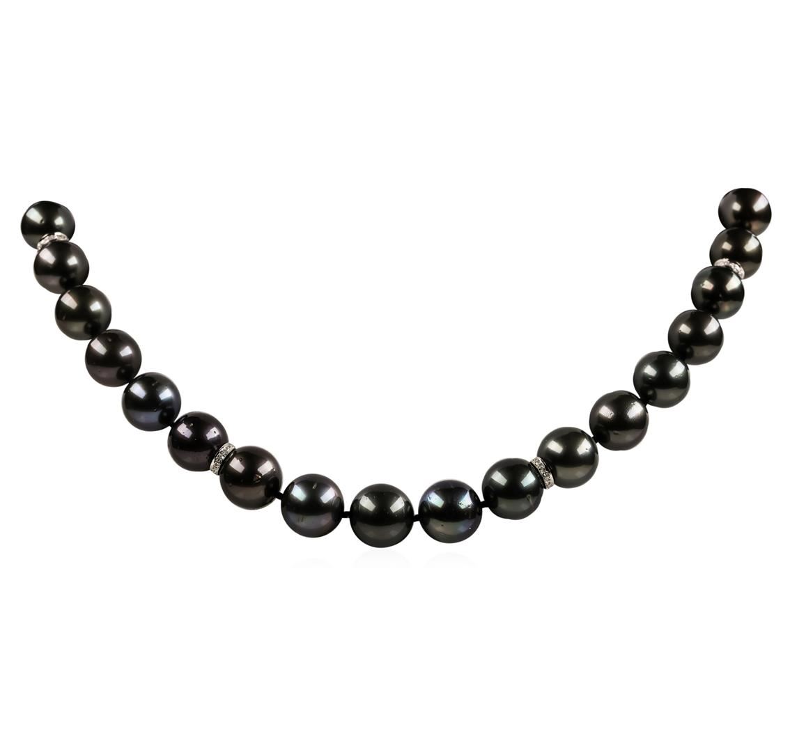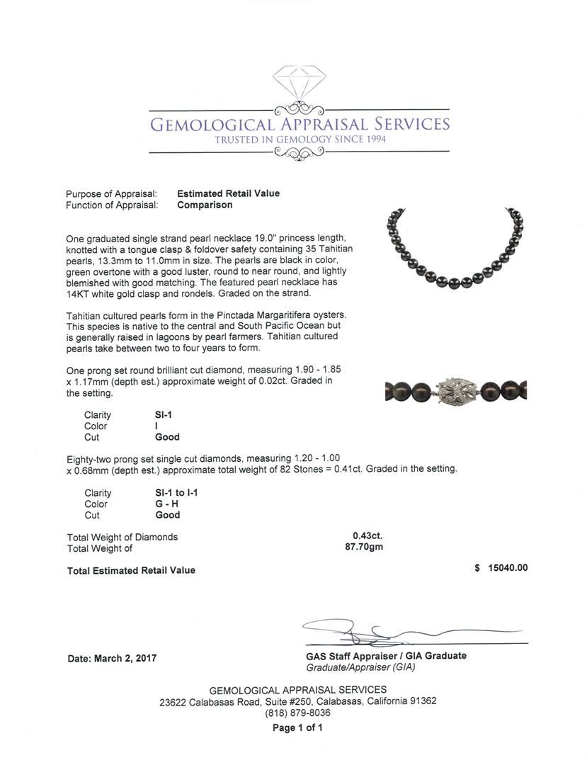 One graduated single strand pearl necklace 19.0' princess length, knotted with a tongue clasp & foldover safety containing 35 Tahitian pearls, 13.3mm to 11.0mm in size. The pearls are black in color, green overtone with a good luster, round to near round, and lightly blemished with good matching. The featured pearl necklace has 14KT white gold clasp and rondels. Graded on the strand.Tahitian cultured pearls form in the Pinctada Margaritifera oysters. This species is native to the central and South Pacific Ocean but is generally raised in lagoons by pearl farmers. Tahitian cultured pearls take between two to four years to form. One prong set round brilliant cut diamond, measuring 1.90 - 1.85 x 1.17mm (depth est.) approximate weight of 0.02ct. Graded in the setting. Color I Clarity SI-1 Cut Good Eighty-Two prong set single cut diamonds, measuring 1.20 - 1.00 x 0.68mm (depth est.) approximate total weight of 82 Stones = 0.41ct. Graded in the setting. Color G - H Clarity SI-1 to I-1 Cut Good. Total Weight of Diamonds 0.43ct.. Total Weight of 87.70gm GAS Appraised at $15,040.00.