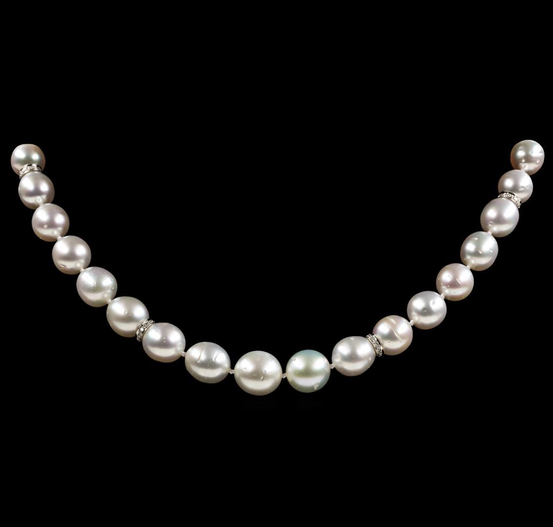 One graduated single strand pearl necklace 18.0' princess length, knotted with a tongue clasp & foldover safety containing 37 south sea cultured pearls, 12.0mm to 9.2mm in size. The pearls are white in color with a good luster, off round, and moderately blemished with good matching. The featured pearl necklace has 14KT white gold clasp and rondels. Graded on the strand.South Sea cultured pearls are farmed in the oceans surrounding Australia, Indonesia, the Philippines and the southern coast of China. The main source of Australian South Sea pearls lies in the northwest on the Kimberly coast. South Sea cultured pearls are formed in the Pinctada Maxima oyster. These pearls take between two to three years to grow and have a unique nacre due to the fast moving and clean waters of the South Seas. Eighty-Four prong set single cut diamonds, measuring 1.10 - 1.00 x 0.65mm (depth est.) approximate total weight of 84 Stones = 0.36ct. Graded in the setting. Color G - H Clarity SI-1 to I-1 Cut Good. Total Weight of Diamonds 0.36ct.. Total Weight of 63.50gm GAS Appraised at $13,395.00.