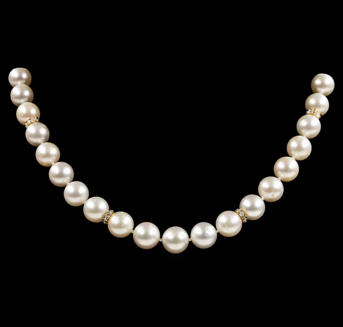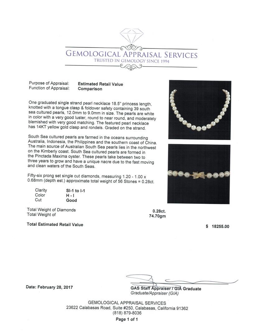 One graduated single strand pearl necklace 18.5' princess length, knotted with a tongue clasp & foldover safety containing 39 south sea cultured pearls, 12.0mm to 9.0mm in size. The pearls are white in color with a very good luster, round to near round, and moderately blemished with very good matching. The featured pearl necklace has 14KT yellow gold clasp and rondels. Graded on the strand.South Sea cultured pearls are farmed in the oceans surrounding Australia, Indonesia, the Philippines and the southern coast of China. The main source of Australian South Sea pearls lies in the northwest on the Kimberly coast. South Sea cultured pearls are formed in the Pinctada Maxima oyster. These pearls take between two to three years to grow and have a unique nacre due to the fast moving and clean waters of the South Seas. Fifty-Six prong set single cut diamonds, measuring 1.20 - 1.00 x 0.68mm (depth est.) approximate total weight of 56 Stones = 0.28ct. Color H - I Clarity SI-1 to I-1 Cut Good. Total Weight of Diamonds 0.28ct.. Total Weight of 74.70gm GAS Appraised at $18,255.00.