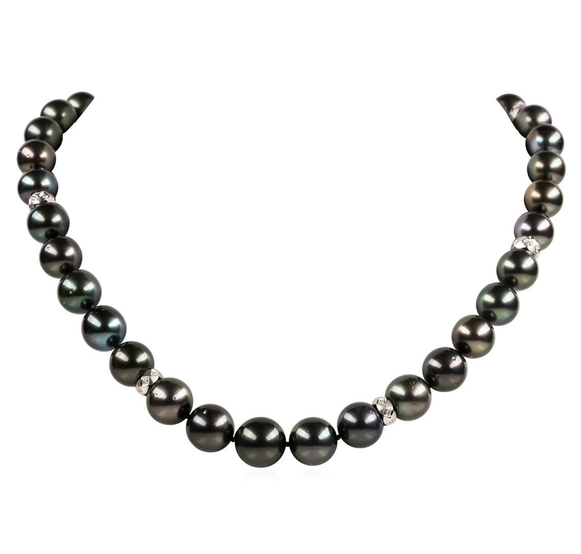 One graduated single strand pearl necklace 19.5' princess length, knotted with a tongue clasp & foldover safety containing 35 Tahitian pearls, 14.3mm to 11.1mm in size. The pearls are black in color, green overtone with a very good luster, round, and lightly blemished with very good matching. The featured pearl necklace has 14KT white gold clasp and rondels. Graded on the strand.Tahitian cultured pearls form in the Pinctada Margaritifera oysters. This species is native to the central and South Pacific Ocean but is generally raised in lagoons by pearl farmers. Tahitian cultured pearls take between two to four years to form. Two bezel set round brilliant cut diamonds, measuring 1.90 - 1.85 x 1.17mm (depth est.) approximate total weight of 2 Stones = 0.05ct. Graded in the setting. Color H - I Clarity VS-2 to SI-1 Cut Good Sixty-Two prong set single cut diamonds, measuring 1.10 - 1.00 x 0.65mm (depth est.) approximate total weight of 62 Stones = 0.27ct. Graded in the setting. Color G - I Clarity SI-1 to I-1 Cut Good. Total Weight of Diamonds 0.32ct.. Total Weight of 102.10gm GAS Appraised at $23,875.00.