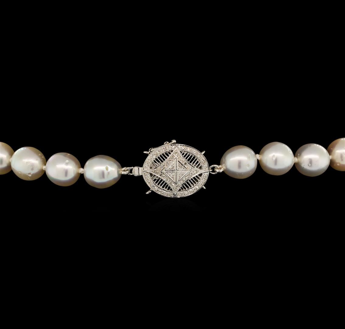 One graduated single strand pearl necklace 18.0' princess length, knotted with a tongue clasp & foldover safety containing 37 south sea cultured pearls, 12.0mm to 9.2mm in size. The pearls are white in color with a good luster, off round, and moderately blemished with good matching. The featured pearl necklace has 14KT white gold clasp and rondels. Graded on the strand.South Sea cultured pearls are farmed in the oceans surrounding Australia, Indonesia, the Philippines and the southern coast of China. The main source of Australian South Sea pearls lies in the northwest on the Kimberly coast. South Sea cultured pearls are formed in the Pinctada Maxima oyster. These pearls take between two to three years to grow and have a unique nacre due to the fast moving and clean waters of the South Seas. Eighty-Four prong set single cut diamonds, measuring 1.10 - 1.00 x 0.65mm (depth est.) approximate total weight of 84 Stones = 0.36ct. Graded in the setting. Color G - H Clarity SI-1 to I-1 Cut Good. Total Weight of Diamonds 0.36ct.. Total Weight of 63.50gm GAS Appraised at $13,395.00.