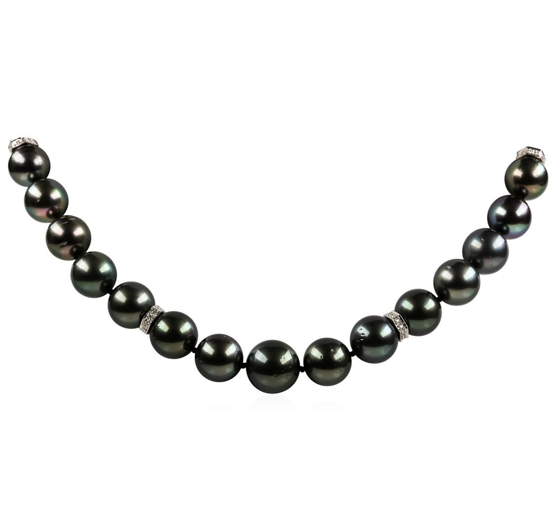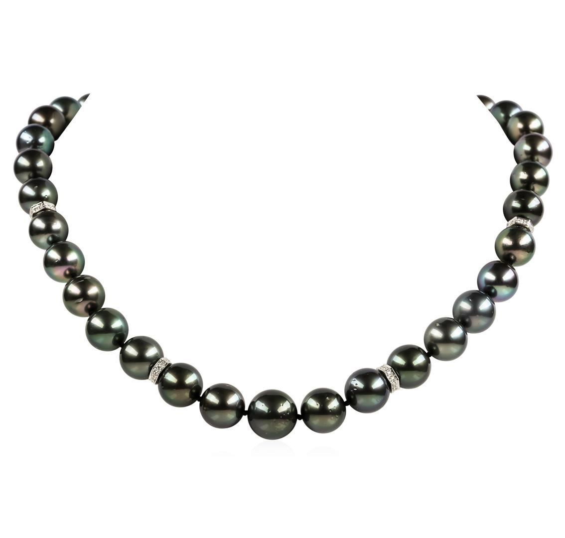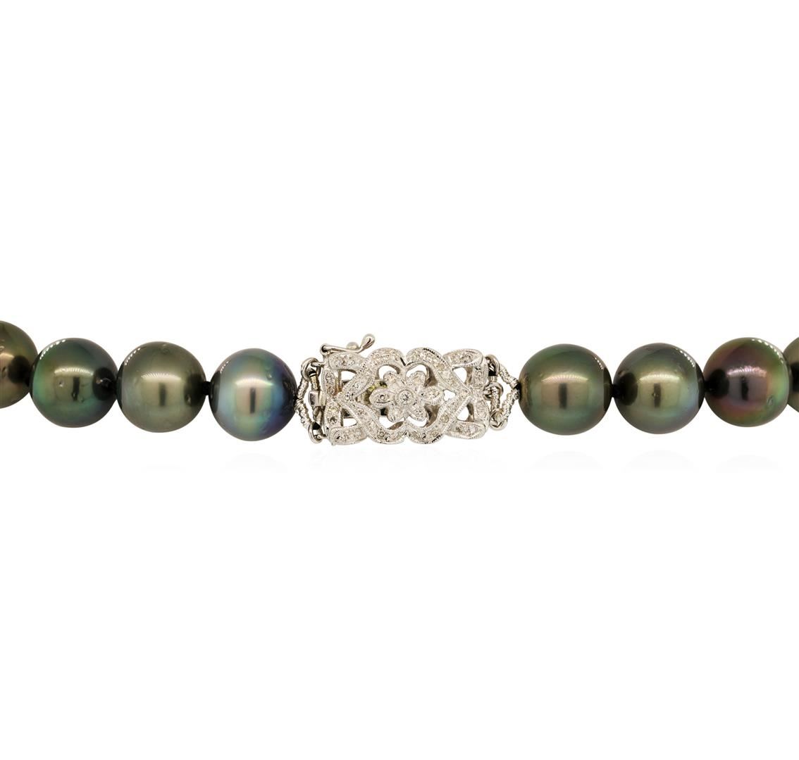One graduated single strand pearl necklace 18.0' princess length, knotted with a tongue clasp & foldover safety containing 35 Tahitian pearls, 13.6mm to 11.0mm in size. The pearls are black in color, green overtone with a very good luster, round, and lightly blemished with very good matching. The featured pearl necklace has 14KT white gold clasp and rondels. Graded on the strand.Tahitian cultured pearls form in the Pinctada Margaritifera oysters. This species is native to the central and South Pacific Ocean but is generally raised in lagoons by pearl farmers. Tahitian cultured pearls take between two to four years to form. One bezel set round brilliant cut diamond, measuring 1.80 - 1.75 x 1.10mm (depth est.) approximate weight of 0.02ct. Graded in the setting. Color H Clarity SI-2 Cut Good Eighty prong set single cut diamonds, measuring 1.10 - 1.00 x 0.65mm (depth est.) approximate total weight of 80 Stones = 0.35ct. Graded in the setting. Color G - H Clarity SI-1 to I-1 Cut Good. Total Weight of Diamonds 0.37ct.. Total Weight of 84.50gm GAS Appraised at $21,500.00.