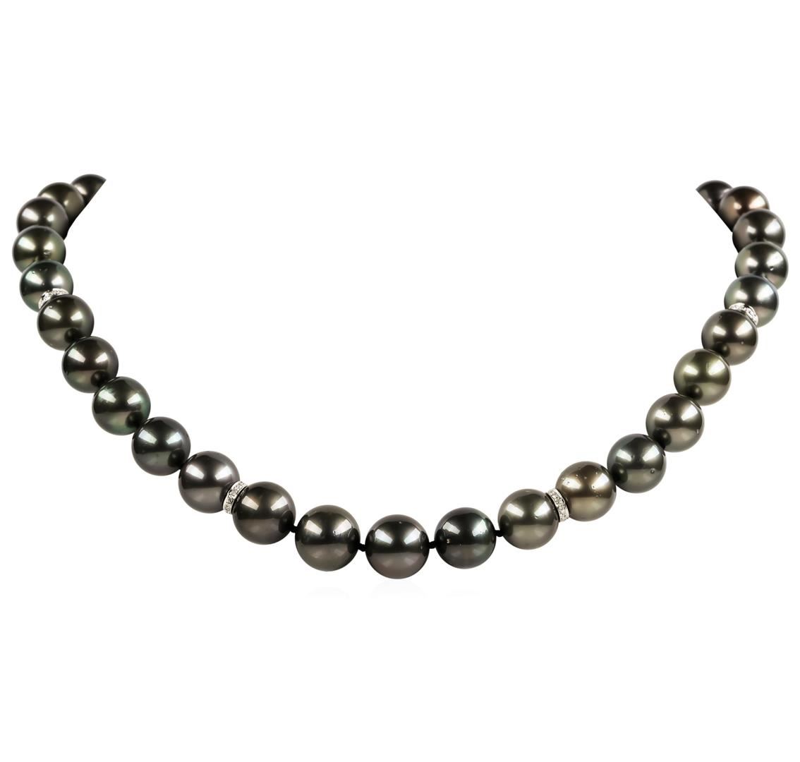 One graduated single strand pearl necklace 18.5' princess length, knotted with a tongue clasp & foldover safety containing 35 Tahitian pearls, 13.0mm to 11.1mm in size. The pearls are black in color, green overtone with a very good luster, round to near round, and lightly blemished with very good matching. The featured pearl necklace has 14KT white gold clasp and rondels. Graded on the strand.Tahitian cultured pearls form in the Pinctada Margaritifera oysters. This species is native to the central and South Pacific Ocean but is generally raised in lagoons by pearl farmers. Tahitian cultured pearls take between two to four years to form. One bezel set round brilliant cut diamond, measuring 1.80 - 1.75 x 1.10mm (depth est.) approximate weight of 0.02ct. Graded in the setting. Color I Clarity SI-1 Cut Good Eighty prong set single cut diamonds, measuring 1.10 - 1.00 x 0.65mm (depth est.) approximate total weight of 80 Stones = 0.35ct. Graded in the setting. Color H - I Clarity SI-1 to SI-2 Cut Good. Total Weight of Diamonds 0.37ct.. Total Weight of 86.10gm GAS Appraised at $21,495.00.