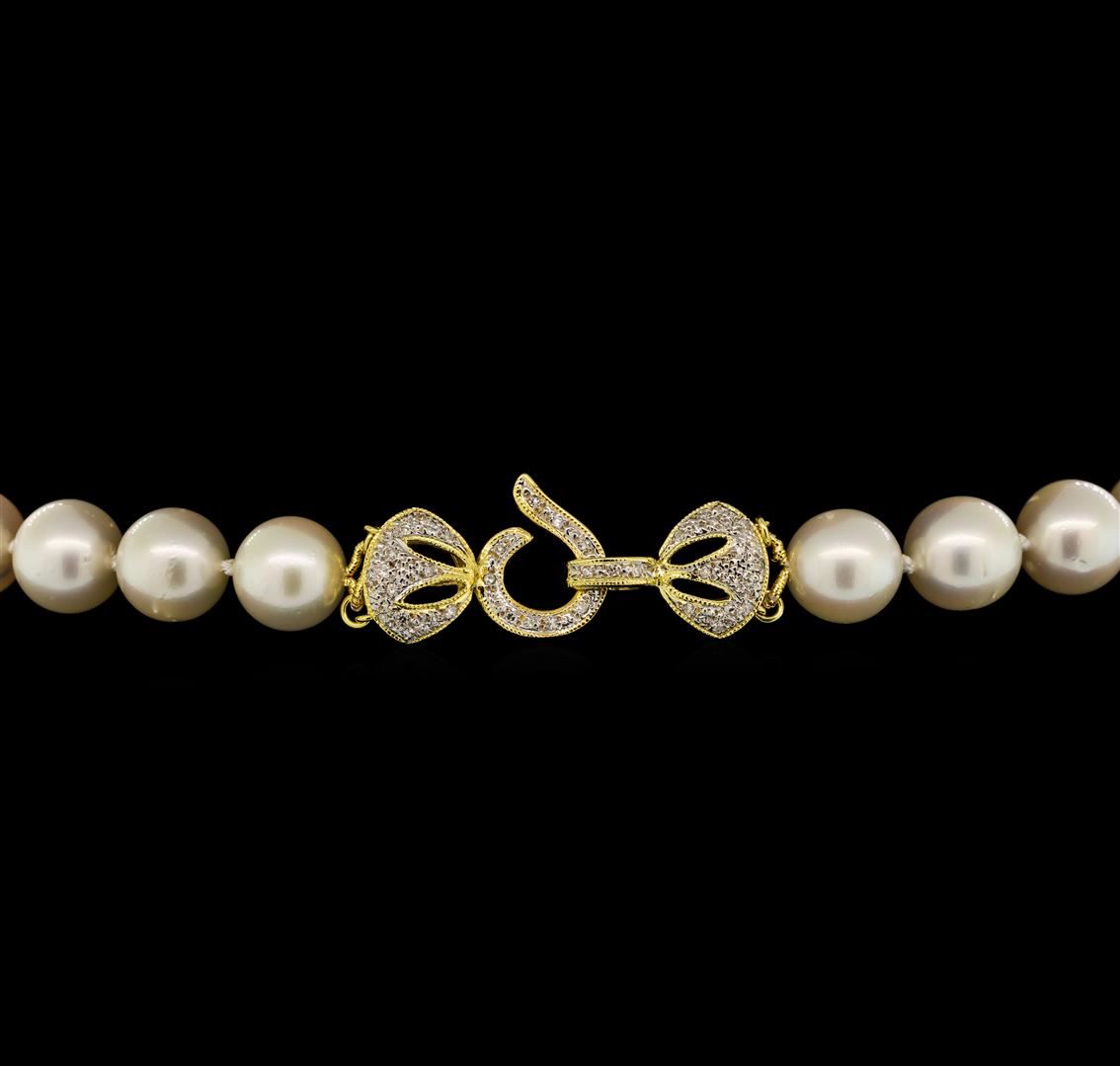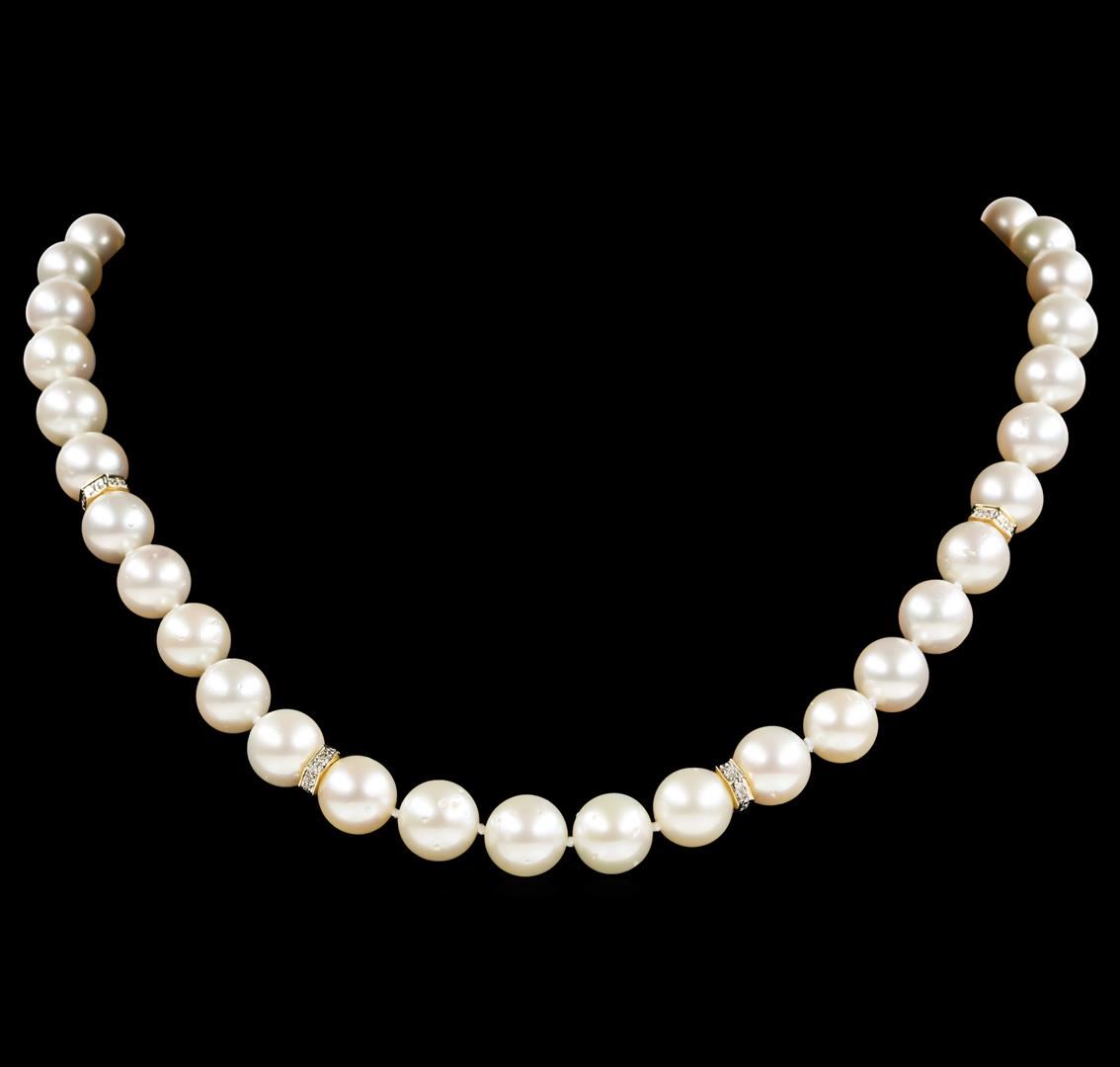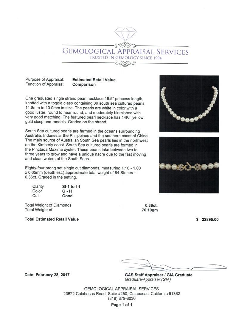 One graduated single strand pearl necklace 19.5' princess length, knotted with a toggle clasp containing 39 south sea cultured pearls, 11.8mm to 10.0mm in size. The pearls are white in color with a good luster, round to near round, and moderately blemished with very good matching. The featured pearl necklace has 14KT yellow gold clasp and rondels. Graded on the strand.South Sea cultured pearls are farmed in the oceans surrounding Australia, Indonesia, the Philippines and the southern coast of China. The main source of Australian South Sea pearls lies in the northwest on the Kimberly coast. South Sea cultured pearls are formed in the Pinctada Maxima oyster. These pearls take between two to three years to grow and have a unique nacre due to the fast moving and clean waters of the South Seas. Eighty-Four prong set single cut diamonds, measuring 1.10 - 1.00 x 0.65mm (depth est.) approximate total weight of 84 Stones = 0.36ct. Graded in the setting. Color G - H Clarity SI-1 to I-1 Cut Good. Total Weight of Diamonds 0.36ct.. Total Weight of 76.10gm GAS Appraised at $22,895.00.