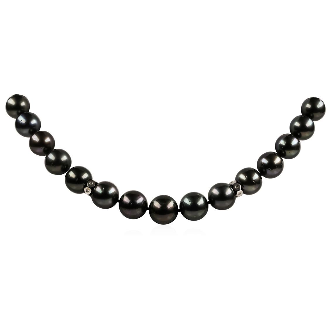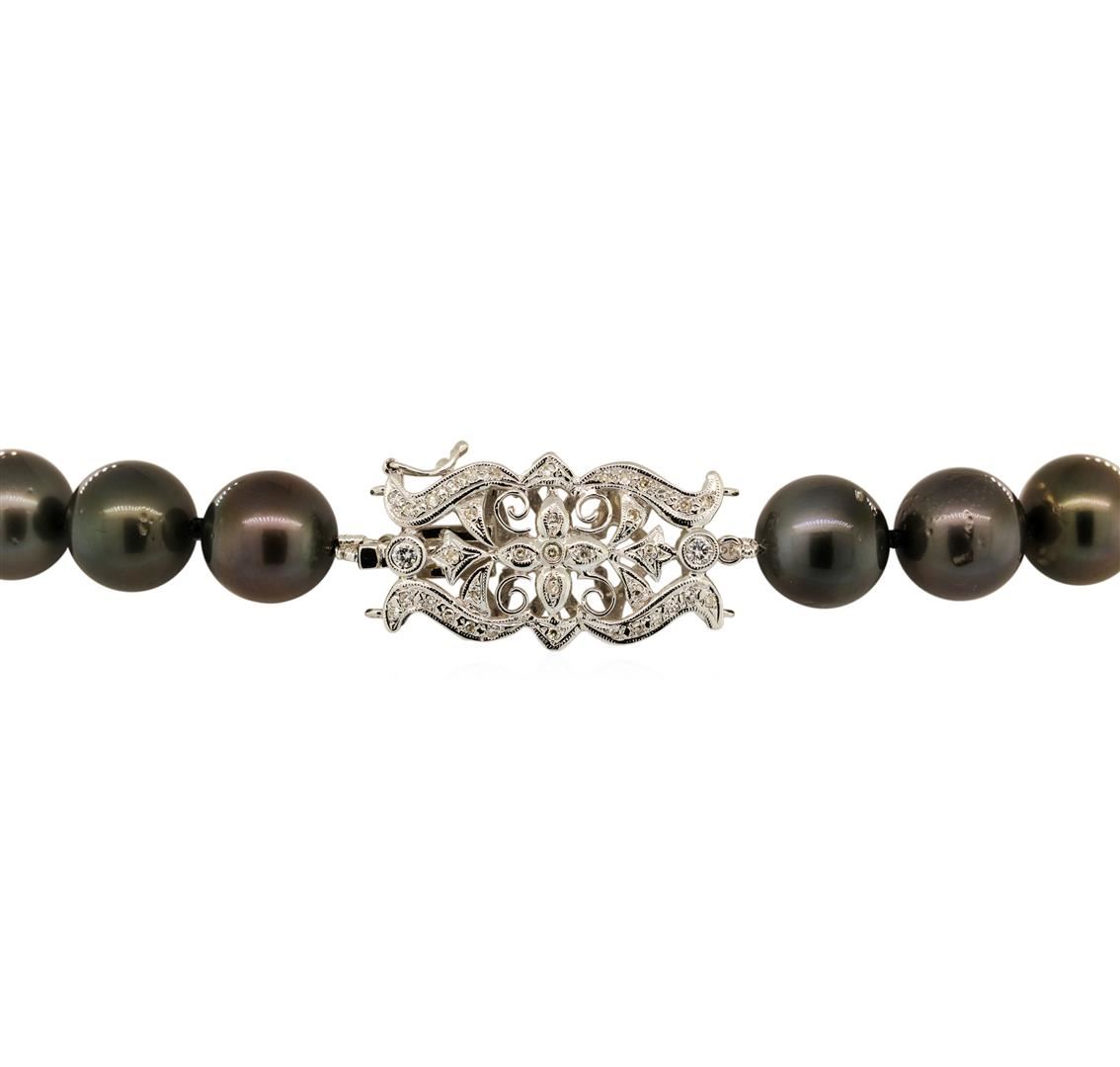 One graduated single strand pearl necklace 19.0' princess length, knotted with a tongue clasp & foldover safety containing 35 Tahitian pearls, 14.2mm to 11.0mm in size. The pearls are black in color, green overtone with a very good luster, round, and lightly blemished. The featured pearl necklace has 14KT white gold clasp and rondels. Graded on the strand.Tahitian cultured pearls form in the Pinctada Margaritifera oysters. This species is native to the central and South Pacific Ocean but is generally raised in lagoons by pearl farmers. Tahitian cultured pearls take between two to four years to form. Two bezel set round brilliant cut diamonds, measuring 2.60 - 2.50 x 1.58mm (depth est.) approximate total weight of 2 Stones = 0.13ct. Graded in the setting. Color G - H Clarity VS-2 to SI-1 Cut Good Thirty-Seven prong set single cut diamonds, measuring 1.10 - 1.00 x 0.65mm (depth est.) approximate total weight of 37 Stones = 0.16ct. Graded in the setting. Color G - I Clarity SI-1 to SI-2 Cut Good. Total Weight of Diamonds 0.29ct.. Total Weight of 100.20gm GAS Appraised at $31,335.00.