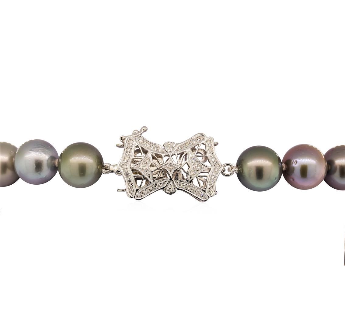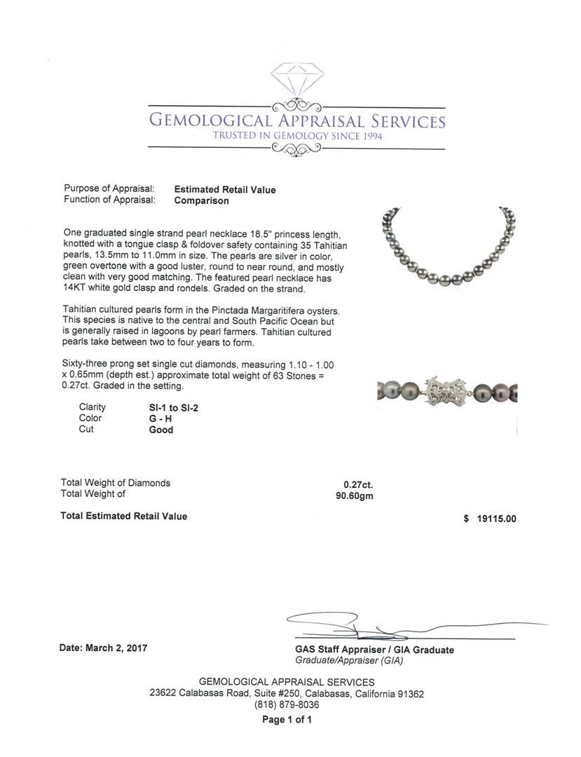 One graduated single strand pearl necklace 18.5' princess length, knotted with a tongue clasp & foldover safety containing 35 Tahitian pearls, 13.5mm to 11.0mm in size. The pearls are silver in color, green overtone with a good luster, round to near round, and mostly clean with very good matching. The featured pearl necklace has 14KT white gold clasp and rondels. Graded on the strand.Tahitian cultured pearls form in the Pinctada Margaritifera oysters. This species is native to the central and South Pacific Ocean but is generally raised in lagoons by pearl farmers. Tahitian cultured pearls take between two to four years to form. Sixty-Three prong set single cut diamonds, measuring 1.10 - 1.00 x 0.65mm (depth est.) approximate total weight of 63 Stones = 0.27ct. Graded in the setting. Color G - H Clarity SI-1 to SI-2 Cut Good. Total Weight of Diamonds 0.27ct.. Total Weight of 90.60gm GAS Appraised at $19,115.00.