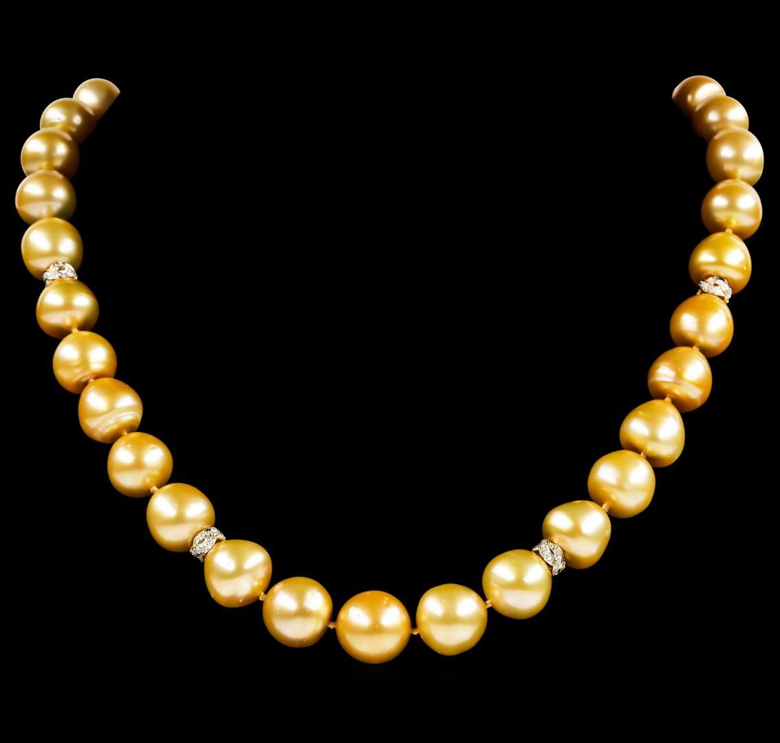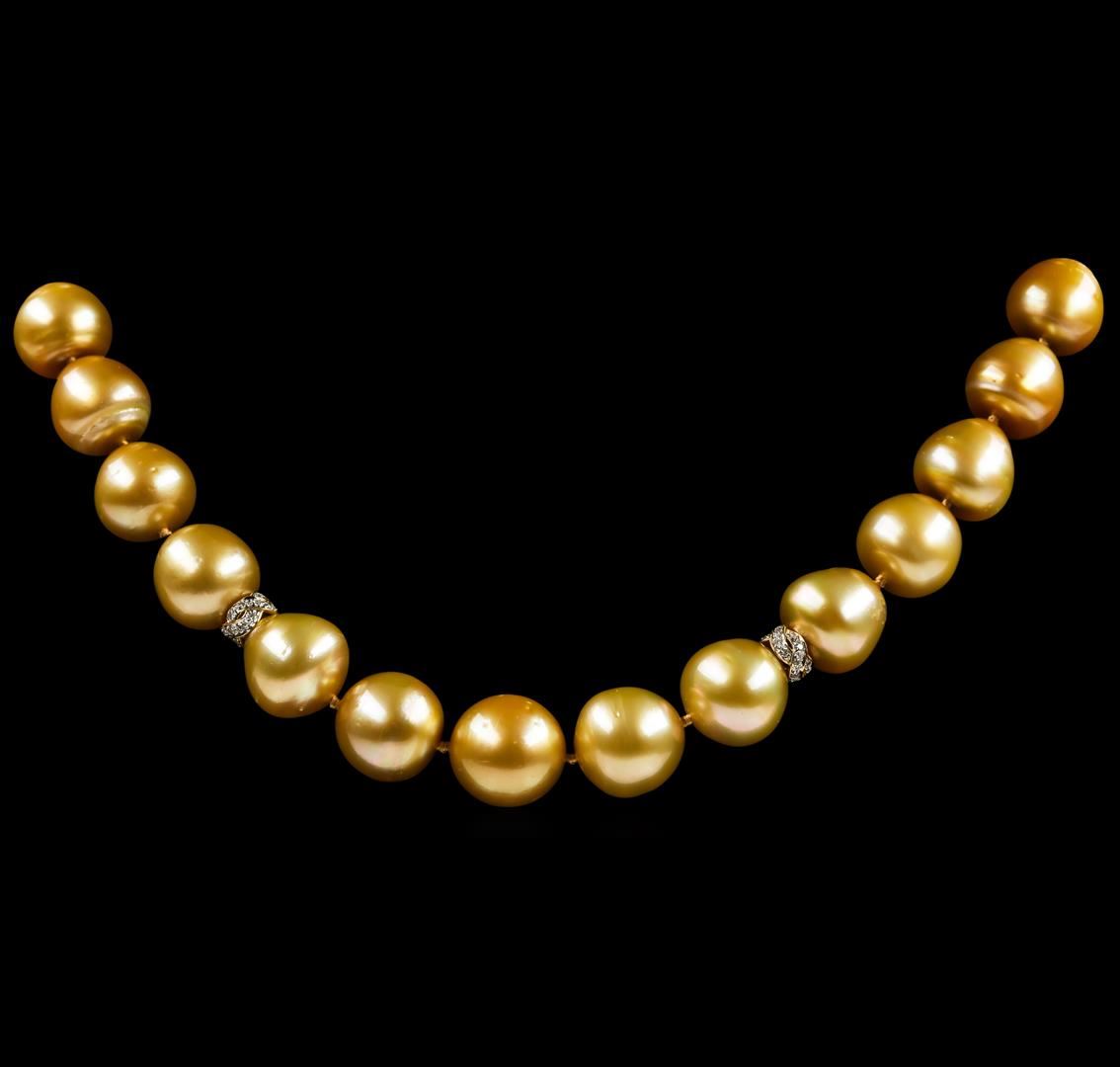 One graduated single strand pearl necklace 19.5' princess length, knotted with a tongue clasp & foldover safety containing 33 south sea cultured pearls, 14.2mm to 12.0mm in size. The pearls are dark golden in color with a good luster, off round, and lightly blemished with very good matching. The featured pearl necklace has 14KT yellow gold clasp and rondels. Graded on the strand.South Sea cultured pearls are farmed in the oceans surrounding Australia, Indonesia, the Philippines and the southern coast of China. The main source of Australian South Sea pearls lies in the northwest on the Kimberly coast. South Sea cultured pearls are formed in the Pinctada Maxima oyster. These pearls take between two to three years to grow and have a unique nacre due to the fast moving and clean waters of the South Seas. One Hundred Twenty-Nine prong set single cut diamonds, measuring 1.10 - 1.00 x 0.65mm (depth est.) approximate total weight of 129 Stones = 0.56ct. Graded in the setting. Color G - H Clarity SI-1 to SI-2 Cut Good. Total Weight of Diamonds 0.56ct.. Total Weight of 106.80gm GAS Appraised at $22,010.00.
