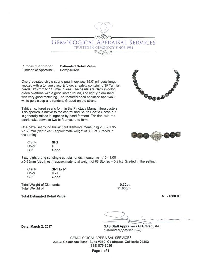 One graduated single strand pearl necklace 19.0' princess length, knotted with a tongue clasp & foldover safety containing 35 Tahitian pearls, 13.7mm to 11.0mm in size. The pearls are black in color, green overtone with a good luster, round, and lightly blemished with very good matching. The featured pearl necklace has 14KT white gold clasp and rondels. Graded on the strand.Tahitian cultured pearls form in the Pinctada Margaritifera oysters. This species is native to the central and South Pacific Ocean but is generally raised in lagoons by pearl farmers. Tahitian cultured pearls take between two to four years to form. One bezel set round brilliant cut diamond, measuring 2.00 - 1.95 x 1.23mm (depth est.) approximate weight of 0.03ct. Graded in the setting. Color H Clarity SI-2 Cut Good Sixty-Eight prong set single cut diamonds, measuring 1.10 - 1.00 x 0.65mm (depth est.) approximate total weight of 68 Stones = 0.29ct. Graded in the setting. Color H - I Clarity SI-1 to I-1 Cut Good. Total Weight of Diamonds 0.32ct.. Total Weight of 91.90gm GAS Appraised at $21,380.00.