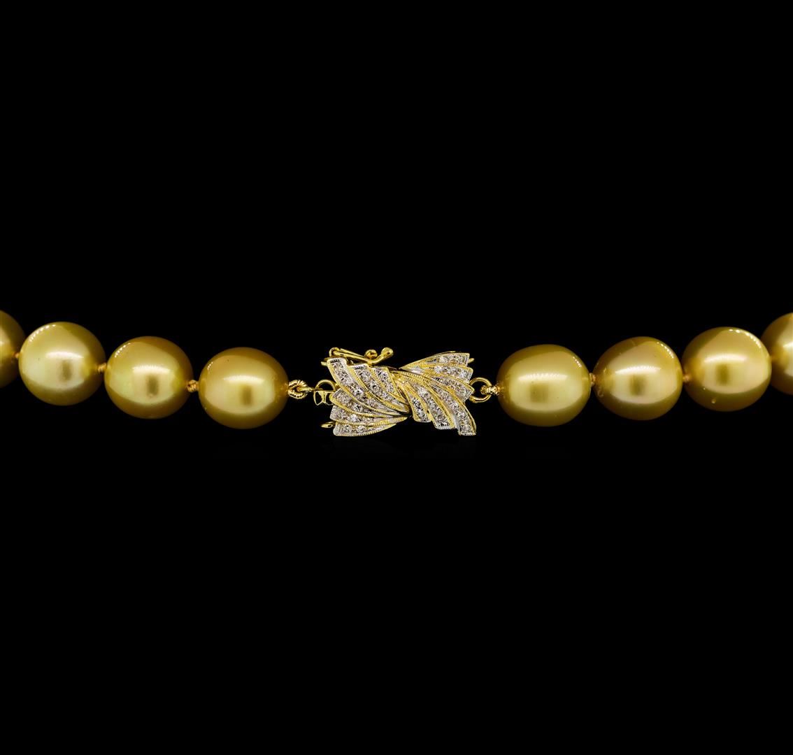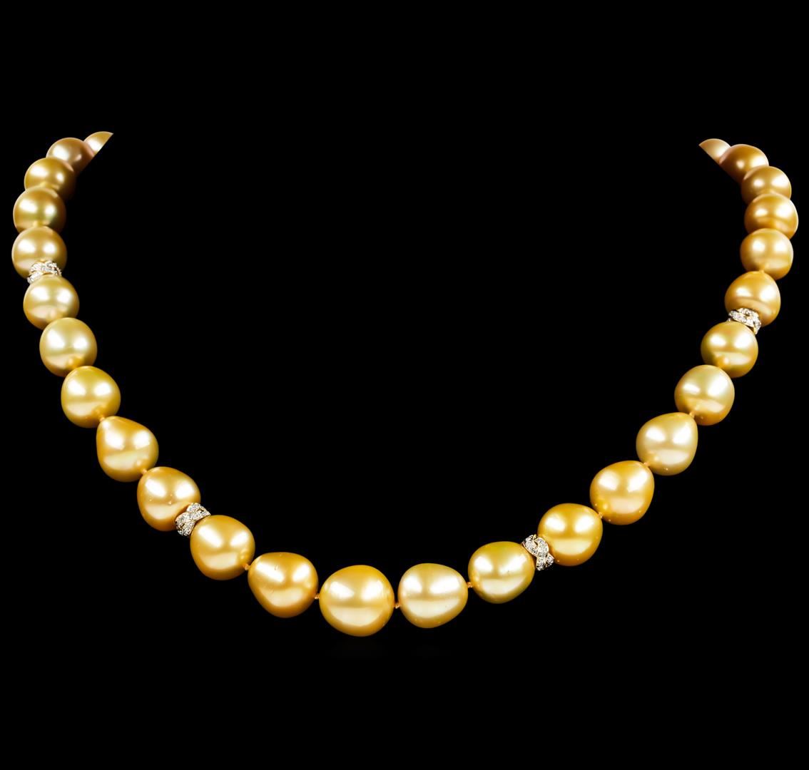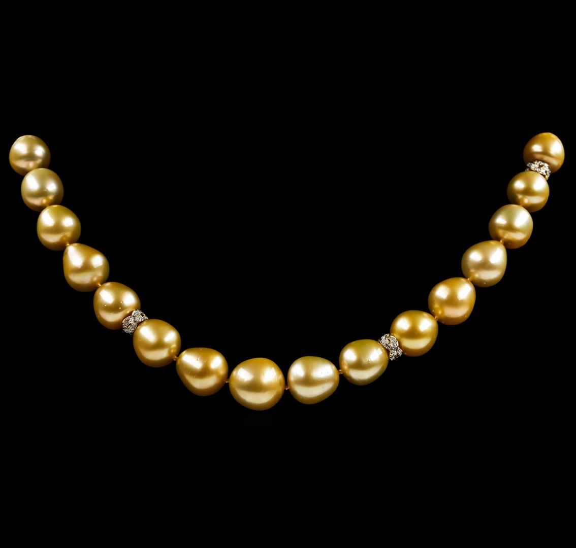 One graduated single strand pearl necklace 19.0' princess length, knotted with a tongue clasp & foldover safety containing 35 south sea cultured pearls, 14.0mm to 10.0mm in size. The pearls are golden in color with a good luster, off round, and mostly clean with good matching. The featured pearl necklace has 14KT yellow gold clasp and rondels. Graded on the strand.South Sea cultured pearls are farmed in the oceans surrounding Australia, Indonesia, the Philippines and the southern coast of China. The main source of Australian South Sea pearls lies in the northwest on the Kimberly coast. South Sea cultured pearls are formed in the Pinctada Maxima oyster. These pearls take between two to three years to grow and have a unique nacre due to the fast moving and clean waters of the South Seas. One Hundred Twelve prong set single cut diamonds, measuring 1.10 - 1.00 x 0.65mm (depth est.) approximate total weight of 112 Stones = 0.50ct. Graded in the setting. Color G - H Clarity SI-1 to I-1 Cut Good. Total Weight of Diamonds 0.50ct.. Total Weight of 86.10gm GAS Appraised at $18,045.00.