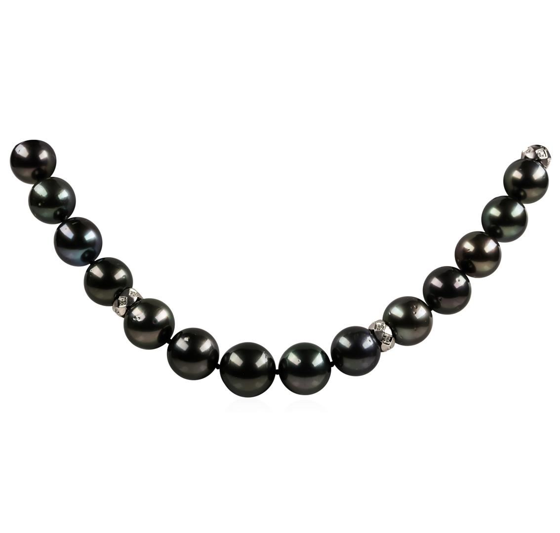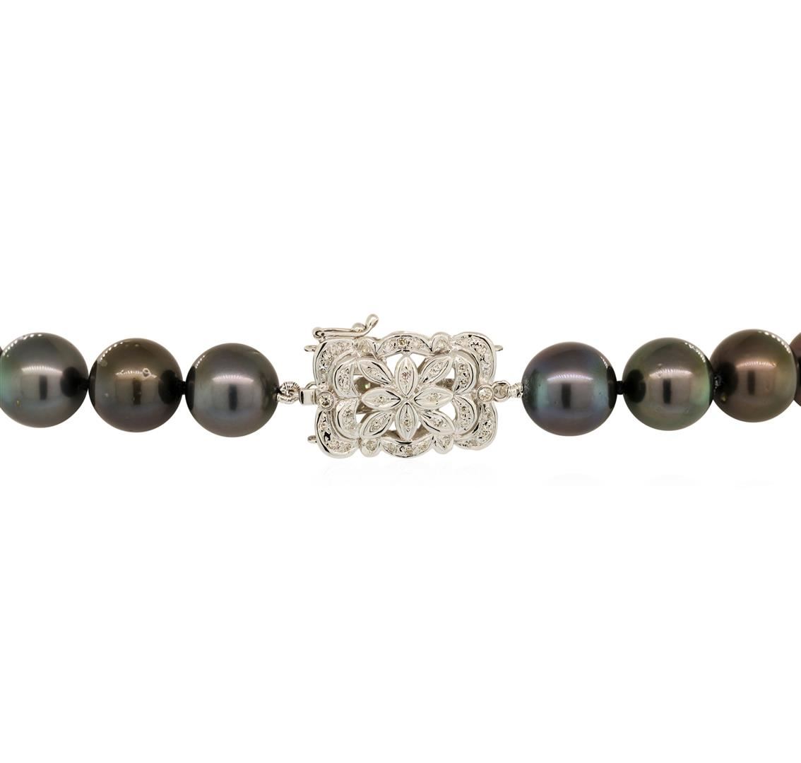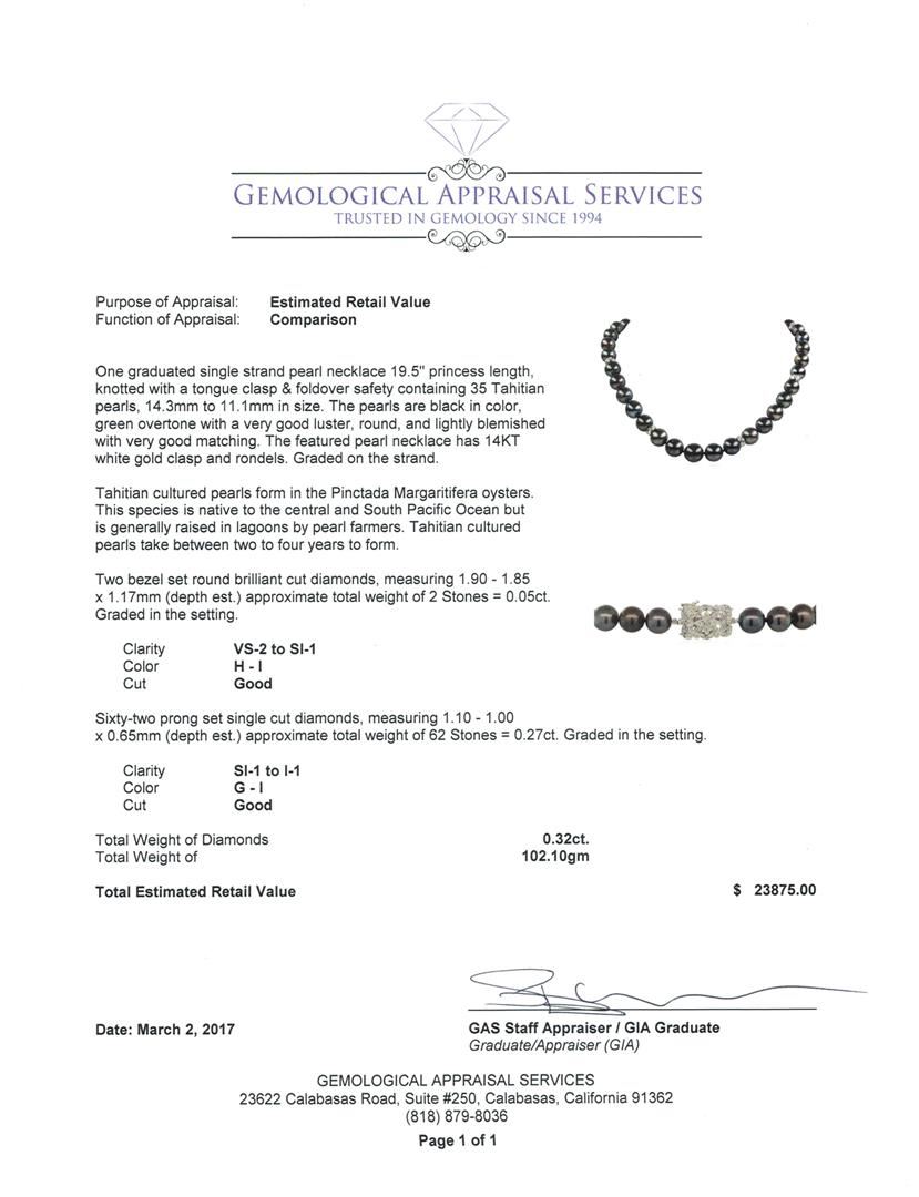 One graduated single strand pearl necklace 19.5' princess length, knotted with a tongue clasp & foldover safety containing 35 Tahitian pearls, 14.3mm to 11.1mm in size. The pearls are black in color, green overtone with a very good luster, round, and lightly blemished with very good matching. The featured pearl necklace has 14KT white gold clasp and rondels. Graded on the strand.Tahitian cultured pearls form in the Pinctada Margaritifera oysters. This species is native to the central and South Pacific Ocean but is generally raised in lagoons by pearl farmers. Tahitian cultured pearls take between two to four years to form. Two bezel set round brilliant cut diamonds, measuring 1.90 - 1.85 x 1.17mm (depth est.) approximate total weight of 2 Stones = 0.05ct. Graded in the setting. Color H - I Clarity VS-2 to SI-1 Cut Good Sixty-Two prong set single cut diamonds, measuring 1.10 - 1.00 x 0.65mm (depth est.) approximate total weight of 62 Stones = 0.27ct. Graded in the setting. Color G - I Clarity SI-1 to I-1 Cut Good. Total Weight of Diamonds 0.32ct.. Total Weight of 102.10gm GAS Appraised at $23,875.00.