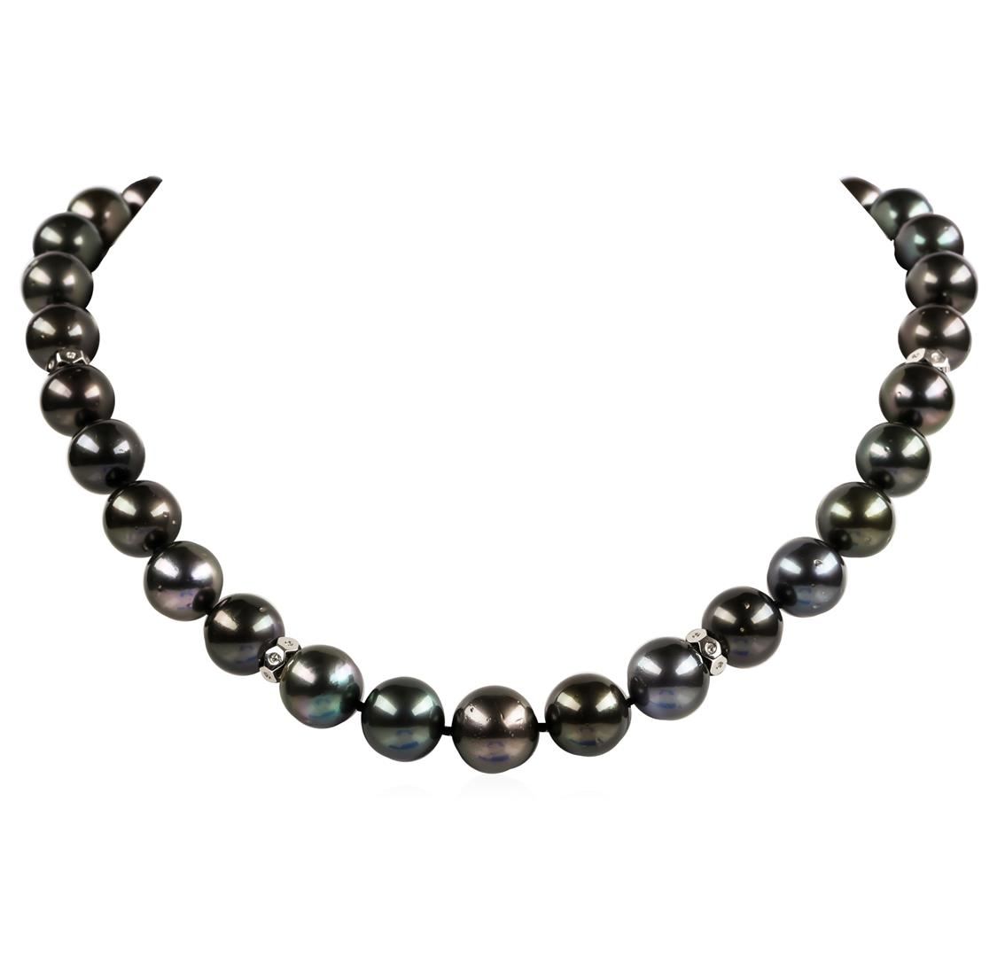 One graduated single strand pearl necklace 19.0' princess length, knotted with a tongue clasp & foldover safety containing 33 Tahitian pearls, 14.7mm to 12.0mm in size. The pearls are black in color, green overtone with a very good luster, round to near round, and mostly clean with very good matching. The featured pearl necklace has 14KT white gold clasp and rondels. Graded on the strand.Tahitian cultured pearls form in the Pinctada Margaritifera oysters. This species is native to the central and South Pacific Ocean but is generally raised in lagoons by pearl farmers. Tahitian cultured pearls take between two to four years to form. One bezel set round brilliant cut diamond, measuring 2.50 - 2.45 x 1.54mm (depth est.) approximate weight of 0.06ct. Graded in the setting. Color H Clarity SI-1 Cut Good Fifty-Eight prong set single cut diamonds, measuring 1.10 - 1.00 x 0.65mm (depth est.) approximate total weight of 58 Stones = 0.25ct. Graded in the setting. Color G - H Clarity SI-1 to SI-2 Cut Good. Total Weight of Diamonds 0.31ct.. Total Weight of 116.30gm GAS Appraised at $36,925.00.