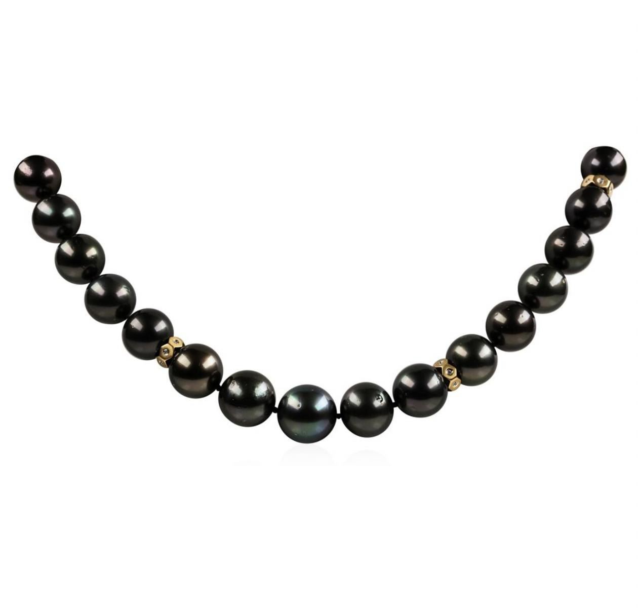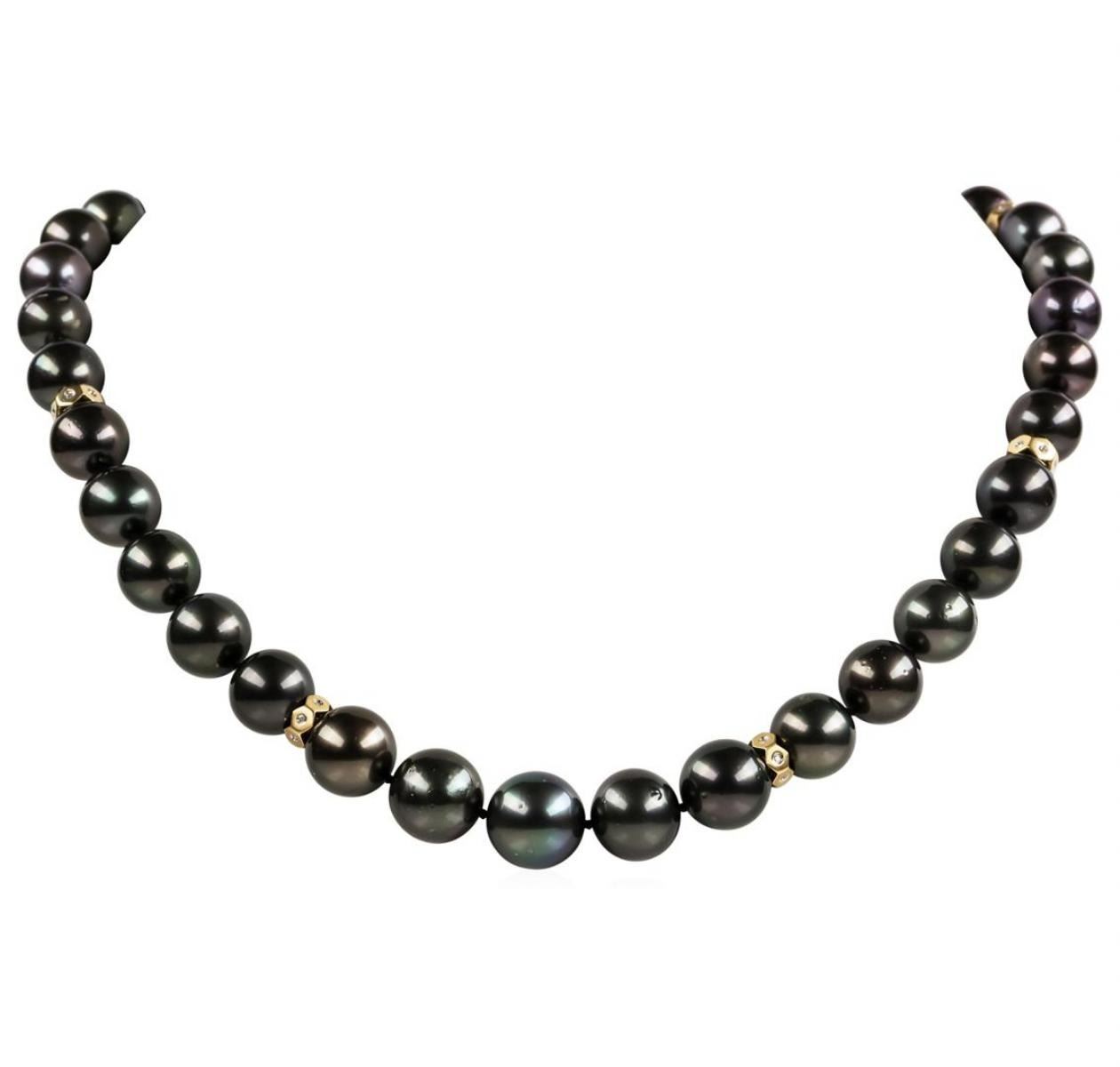 One graduated single strand pearl necklace 19.5' princess length, knotted with a tongue clasp & foldover safety containing 35 Tahitian pearls, 14.4mm to 11.0mm in size. The pearls are black in color, green overtone with a very good luster, round to near round, and lightly blemished with very good matching. The featured pearl necklace has 14KT yellow gold clasp and rondels. Graded on the strand.Tahitian cultured pearls form in the Pinctada Margaritifera oysters. This species is native to the central and South Pacific Ocean but is generally raised in lagoons by pearl farmers. Tahitian cultured pearls take between two to four years to form. Three bezel set round brilliant cut diamonds, measuring 2.10 - 2.00 x 1.27mm (depth est.) approximate total weight of 3 Stones = 0.10ct. Graded in the setting. Color H - I Clarity SI-1 to SI-2 Cut Good One Hundred Four prong set single cut diamonds, measuring 1.10 - 1.00 x 0.65mm (depth est.) approximate total weight of 104 Stones = 0.45ct. Graded in the setting. Color G - I Clarity SI-1 to I-1 Cut Good. Total Weight of Diamonds 0.55ct.. Total Weight of 103.80gm GAS Appraised.